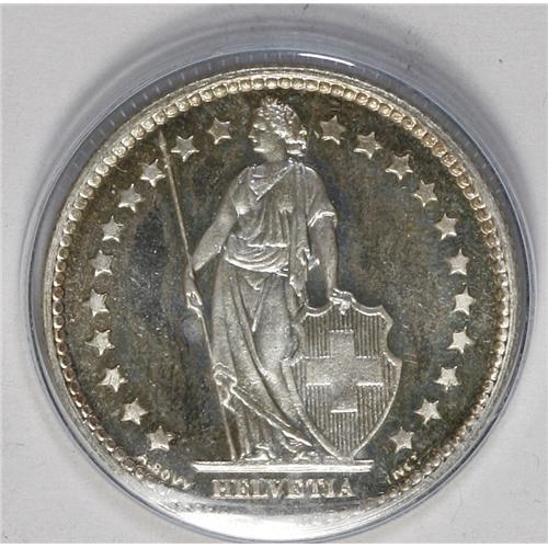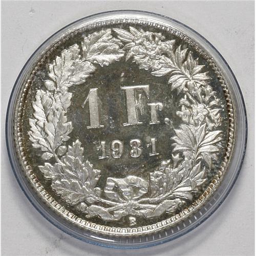 <B>Confederation Specimen 1 Franc 1931B,</B></I> KM24, Lightly toned, Gem Specimen. A nice cameo example and very scarce as a Specimen.