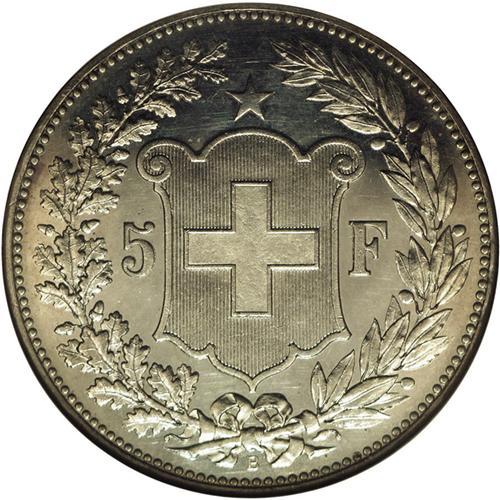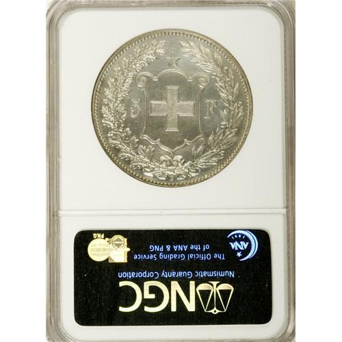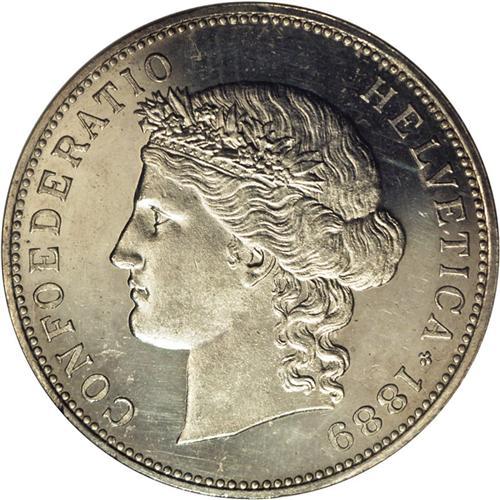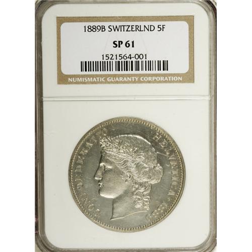 <B>Confederation. Specimen 5 Francs 1889-B,</B></I> KM-34, SP61 NGC. Harshly graded. This is a deeply mirrored coin with light frosting on the devices. The few tiny abrasions and the light hairlines do not take much away from the stark brilliance of this beautiful coin. Very rare.<BR><BR><b>Shipping:</b> Coin/Currency (<a target="_blank" href="http://www.heritageauctions.com/common/shipping.php">view shipping information</a>)