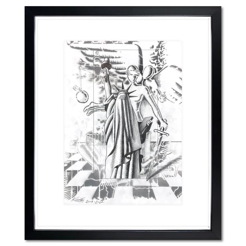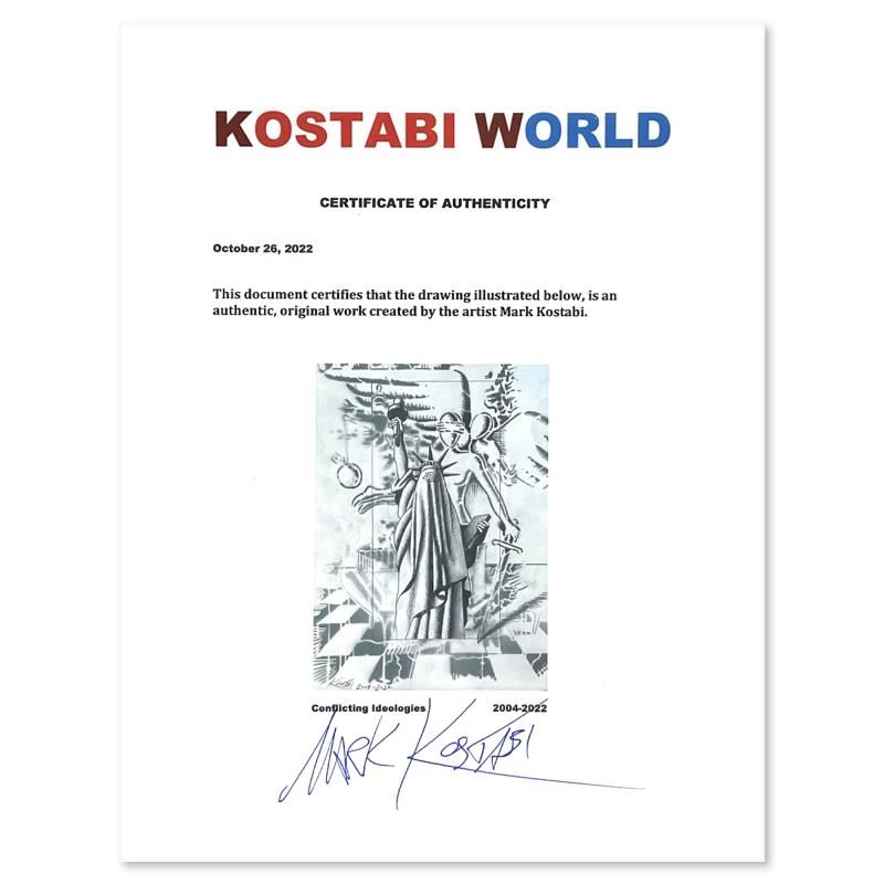 "Conflicting Ideologies" is an original drawing on paper by Mark Kostabi, hand signed by the artist. This piece is dated 2004-2022, which refers to the start and completion dates for the piece. This piece comes custom framed. Includes Certificate of Authenticity. Measures approx. 15" x 18" (frame), 9.5" x 13" (image).