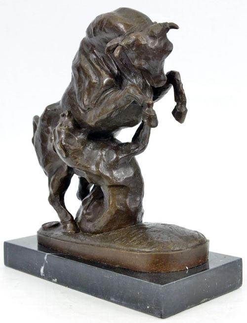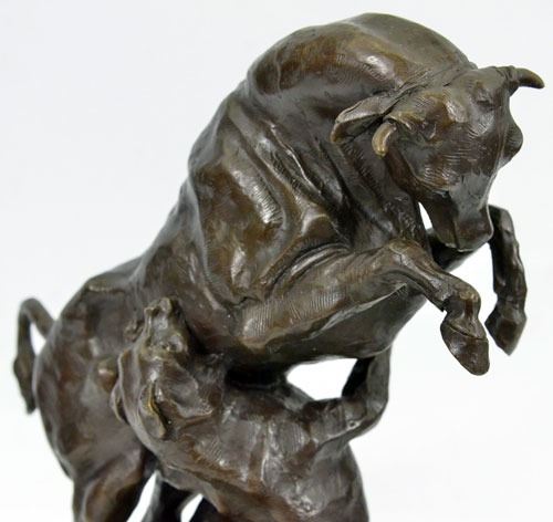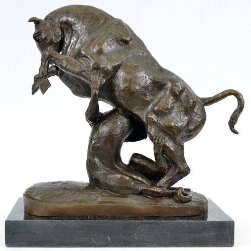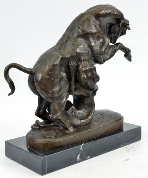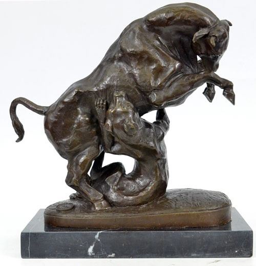 100% bronze sculpture, this brown patina sculpture was cast using the "lost wax method" and mounted on a black marble base. A Spanish Bull Dominates A Dog That Is Half Its Size. The Canine Is Trying With All Its Strength And Might To Overpower The Bull. The Dogs Paws Dig Into The Bulls Flesh, Leaving Marks Visible On The Sculpture. In This Vicious Fight Either The Bull'S Brute Strength Or The Dogs Prowess And Determination That Will Triumph. This sculpture is very interesting a bronze recast based on the original piece. Confrontation Between Bull and Dog bronze Sculpture on marble base size:12X12 inches.