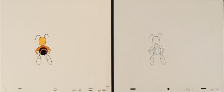 Here, it appears that Buzz is confused. This is an original animation cel & drawing from the production of the Cheerios cereal commercial. * Medium: Hand painted acetate cel with drawing * Cel size: 10 1/2 x 12 1/2 inchesDrawing size: 10 1/2 x 12 1/2 inches * Details: Number and peg holes at the bottom edgeCondition: Very goodPencil color: non-photo blue and black