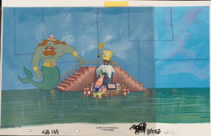 To create production cels, the original animator's drawing is transferred onto an acetate cel (by hand-inking and/or photo copying). The cel is then hand-painted on the reverse side. The background accompanying this set-up is a reproduction background. The printed background is ready to be matted and framed. The notations are located at the bottom of both. The cel is multi-layered: first is Patrick's eyes, next is Patrick, then are Spongebob's eyes, followed by Spongebob's body, and finally King Neptune.