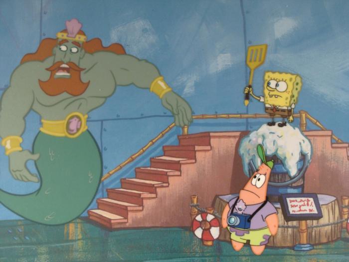 This animation cel and reproduction background are from the Nickelodeon TV show SpongeBob Squarepants. The story takes place under the deep blue sea in Bikini Bottom, where SpongeBob resides. SpongeBob, who is a yellow, porous sponge, is your typical happy-go-lucky character, as he is always cheerful and enjoys making people laugh. Patrick Star, SpongeBob's neighbor who is a starfish, is your average children's show idiot, as he boasts knowing nothing and is often getting himself into ridiculous situations. Between the homes of these two lies the home of the miserable Squidward, a squid, who is known for being grouchy and playing tricks on SpongeBob and Patrick. Both SpongeBob and Squidward work at the Krusty Krab, a fast food business run by the greedy money-loving Mr. Krabs, a crab, the arch rival of the evil, possibly misunderstood, Plankton. Another neighbor, Sandy Cheeks, an athletic squirrel who normally wears an astronaut's space suit, was introduced in "Tea at the Treedome." She spends most of her time inventing and experimenting. It seems like Spongebob, Patrick, and King Neptune are dazed and confused...Original Printed Background and Animated Cel Overall Size of Background: 11" x 17" Overall Size of the Cels: 10 1/2" x 16 1/2" Excellent condition This is an original hand-painted cel set-up used in the production of an episode of "SpongeBob SquarePants." Each one-of-a-kind set-up represents a slight change in position of the characters. When individually photographed and projected in rapid succession, the images appear to move.