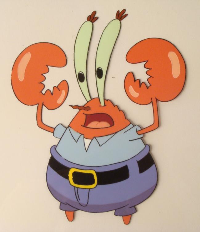 This original animation cel is from the Nickelodeon TV show SpongeBob Squarepants. The story takes place under the deep blue sea in Bikini Bottom, where SpongeBob resides. SpongeBob, who is a yellow, porous sponge, is your typical happy-go-lucky character, as he is always cheerful and enjoys making people laugh. Patrick Star, SpongeBob's neighbor who is a starfish, is your average children's show idiot, as he boasts knowing nothing and is often getting himself into ridiculous situations. Between the homes of these two lies the home of the miserable Squidward, a squid, who is known for being grouchy and playing tricks on SpongeBob and Patrick. Both SpongeBob and Squidward work at the Krusty Krab, a fast food business run by the greedy money-loving Mr. Krabs, a crab, the arch rival of the evil, possibly misunderstood, Plankton. Another neighbor, Sandy Cheeks, an athletic squirrel who normally wears an astronaut's space suit, was introduced in "Tea at the Treedome." She spends most of her time inventing and experimenting. * Mr. Krabs looks confused * Original Production Animated Cel Overall Size of Cel: 10 1/2" x 12 1/2" Very Good Condition This is an original hand-painted cel set-up used in the production of an episode of "SpongeBob SquarePants." Each one-of-a-kind set-up represents a slight change in position of the characters. When individually photographed and projected in rapid succession, the images appear to move. * To create production cels, the original animator's drawing is transferred onto an acetate cel (by hand-inking and/or photo copying). The cel is then hand-painted on the reverse side. * The cel is ready to be matted and framed. The animator's notations are at the bottom of the cel. *