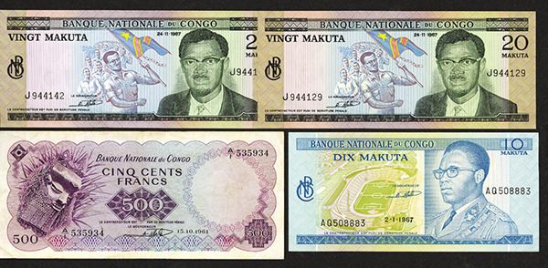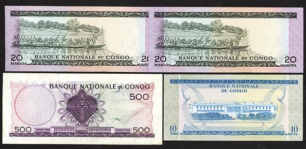 Congo. 500 Francs. SCWPM 7a. 15.10.1961, First date of type. Fine+; 10, 20 Makuta. SCWPM 9a, 10a (2). Choice Uncirculated. 4 pieces.