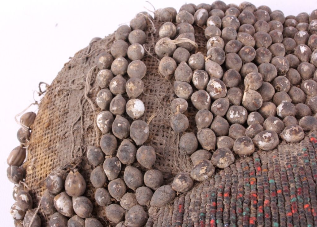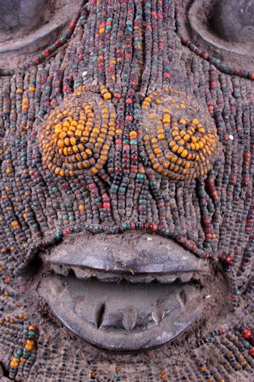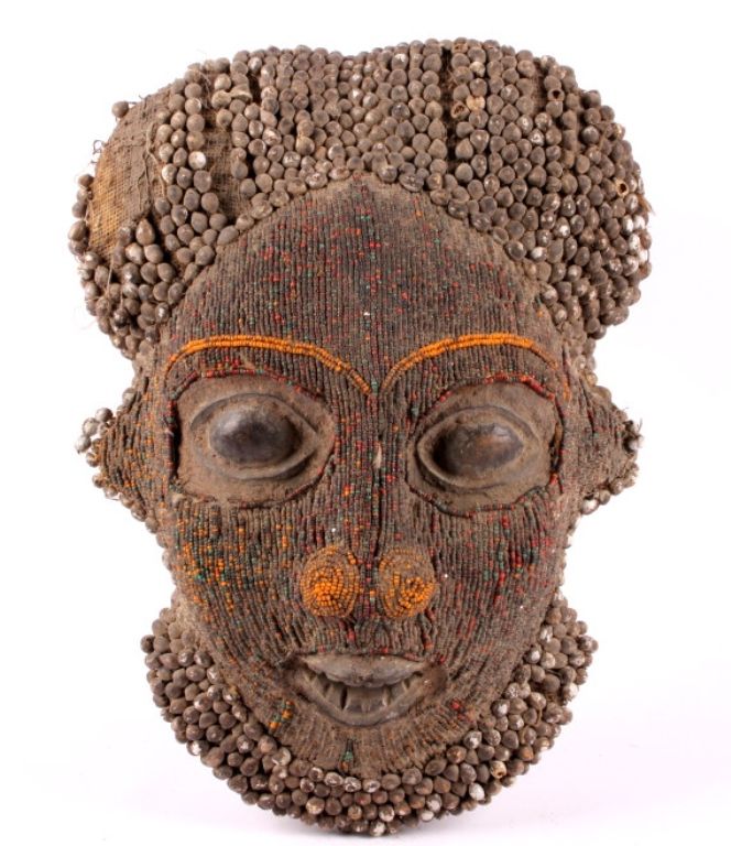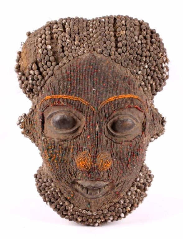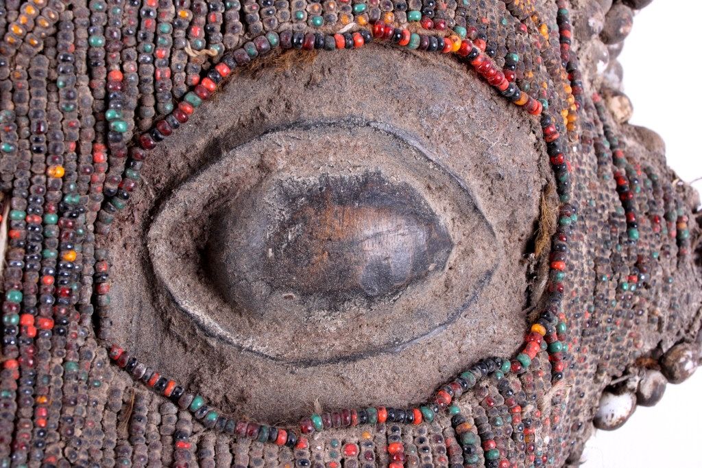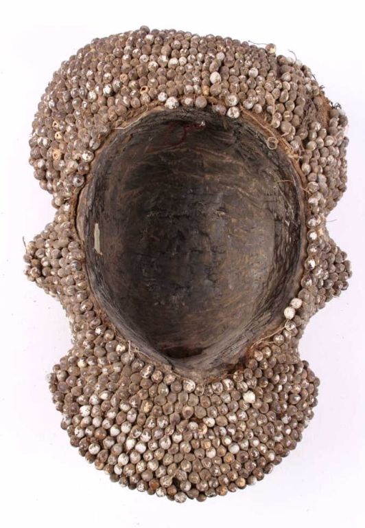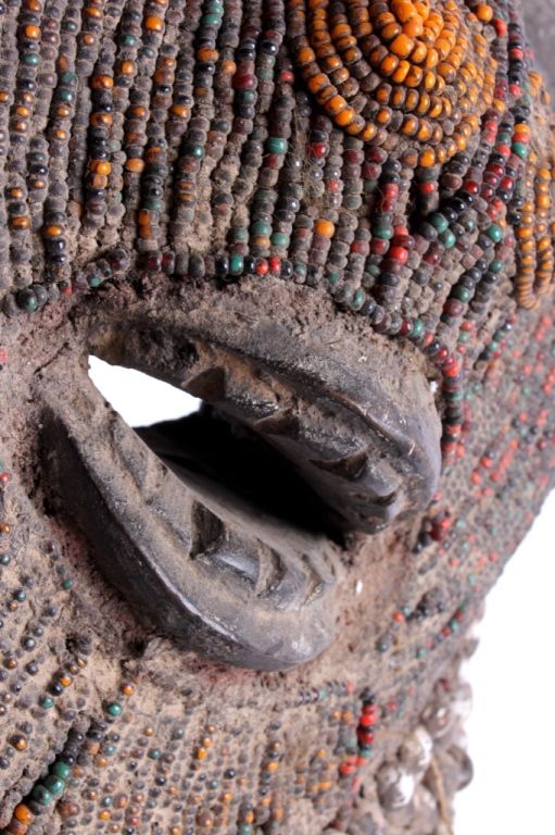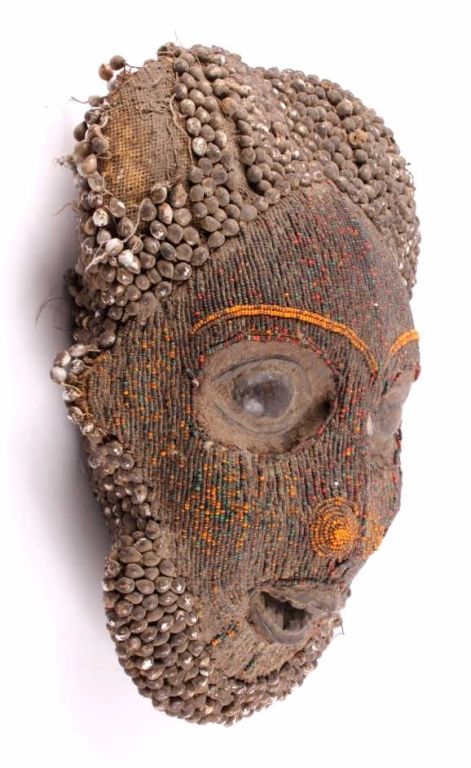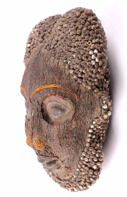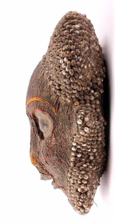 The piece shows a hand carved solid wood mask with the front covered in glass trade beads framed in white seeds. The mask is from the early 1900's in good condition with the top edge missing some of the white larger beads.The mask is a very rare and desirable piece hand made by the tribal people to use. Measures 126.5"x11.5" and 6.5" deep.