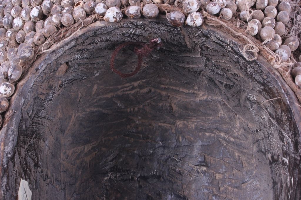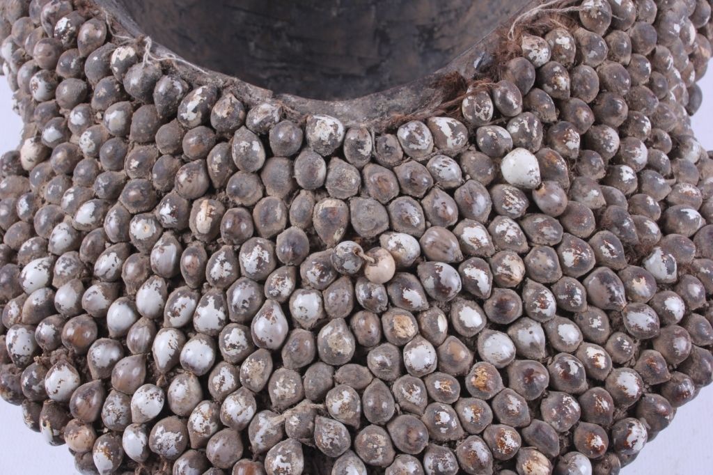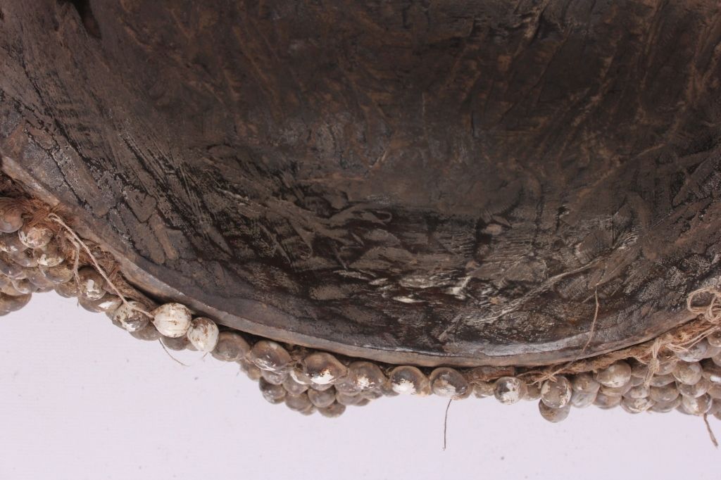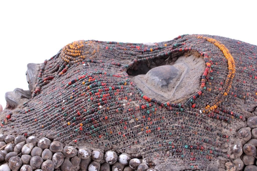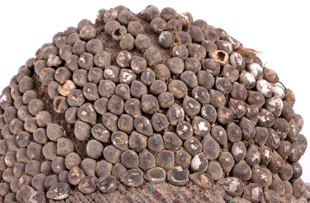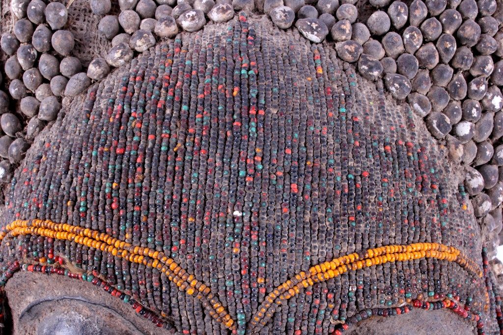 The piece shows a hand carved solid wood mask with the front covered in glass trade beads framed in white seeds. The mask is from the early 1900's in good condition with the top edge missing some of the white larger beads.The mask is a very rare and desirable piece hand made by the tribal people to use. Measures 126.5"x11.5" and 6.5" deep.