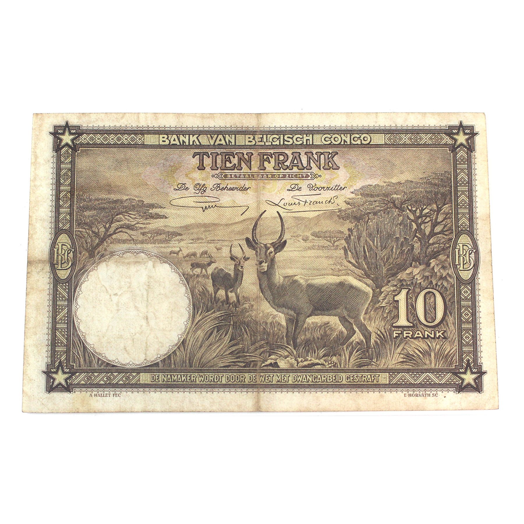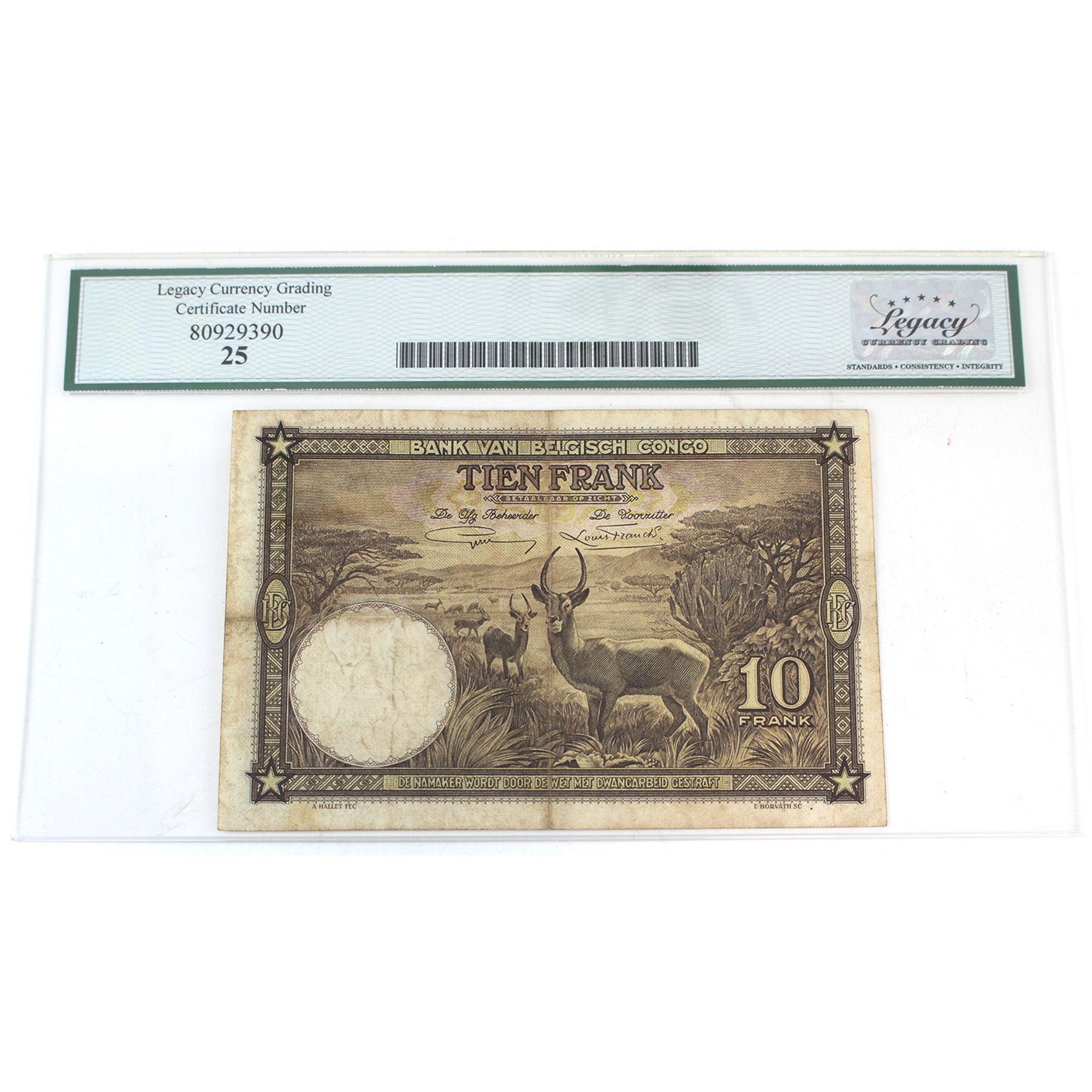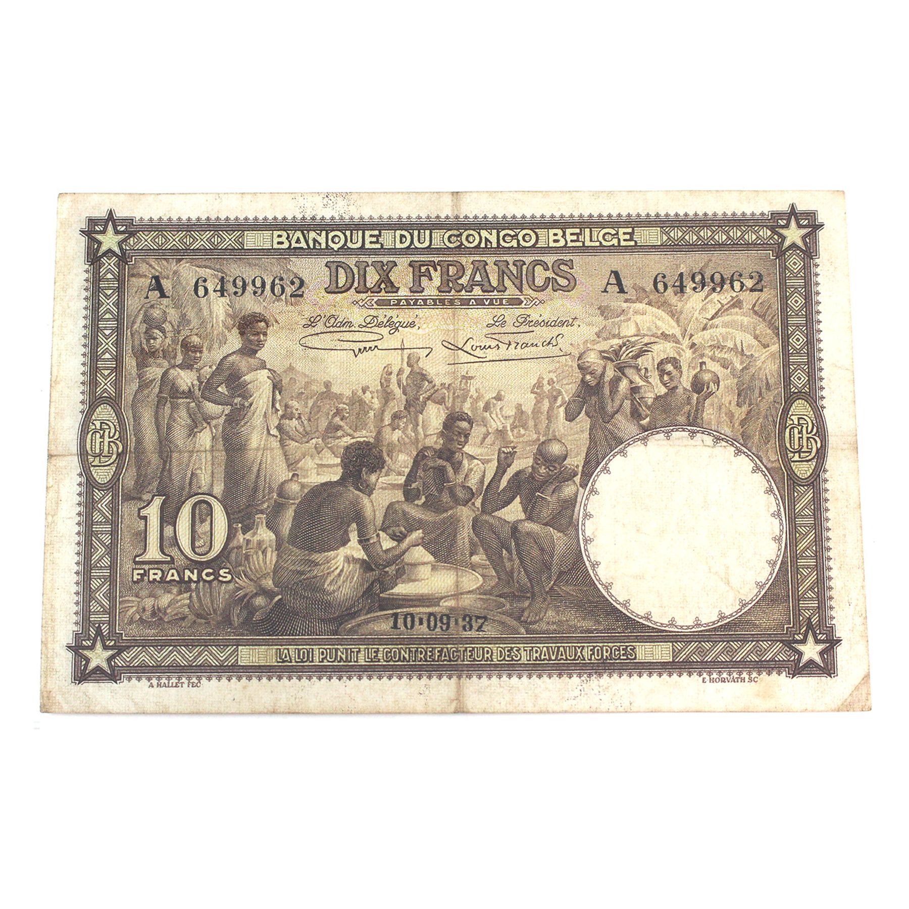 Congo, Belgian 1937 Pick#9, 10 Francs Legacy VF25 SN: A649962