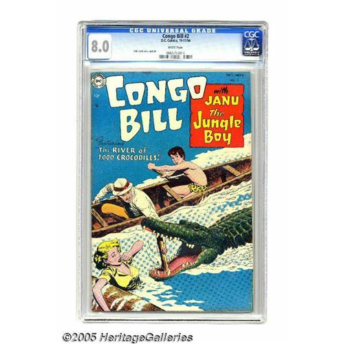 <B>Congo Bill #2 (DC, 1954) CGC VF 8.0 White pages.</B></I> Bill comes to the rescue of a lovely lady in ""the River of 1,000 Crocodiles!"" Nick Cardy gets cover and interior art credit for this hard-to-find second issue. Overstreet 2005 VF 8.0 value = $880. CGC census 7/05: 2 in 8.0, none higher. <BR><BR><B>Important notice:</B> Heritage usually auctions material at the rate of 200-250 lots per hour. On some occasions eBay Live bid software or the Internet may not be able to keep up with the pace of the auction. We recommend placing a realistic absentee bid now as insurance to avoid disappointment. Occasionally the auctioneer may eliminate or reject an eBay Live bid, and the auctioneer may also reopen a lot after the close of the eBay live bidding (usually because we missed an audience bid), and may reject your bid even if it shows you as the winning bidder. By bidding via eBay Live, you agree that Heritage may award the lot to another bidder at its sole discretion under the circumstances described above or any other reasonable circumstances. Since eBay bids are not shown to us until we open the lot on the floor, we treat those bids just like floor bids. In most cases the floor responds before the eBay bid is presented to us, due to Internet lag time, so for consistency we have made it a policy that floor bids are always considered first over tie eBay live bids. Also please note that all Heritage lots purchased through eBay Live carry a 20% Buyer's Premium. Please make sure you read the Terms and Conditions before you bid. This lot is being auctioned in conjunction with a live floor auction by Heritage Galleries & Auctioneers. All final auction and invoice information will be supplied by Heritage Galleries & Auctioneers, and all other information should be considered preliminary. Lot:2110 <BR><BR><B>Winning Notification and Billing:</B> After the FINAL session in this auction is complete, Heritage will send e-mail and snail mail invoices. This process normally take