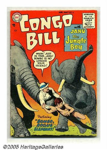 <B>Congo Bill #5 (DC, 1955) Condition: VF-.</B></I> This is the first time we've offered a copy of #5, which Overstreet calls scarce, noting that the book is "rarely found in Fine to Mint condition." So this VF- copy with off-white pages is quite a find. It couldn't be certified by CGC because of an overhang at the top, but note that the top CGC-graded copy to date is a VG+, so our offering may well be the best one around. The issue's cover is by Nick Cardy. Overstreet 2005 VF 8.0 value = $680.