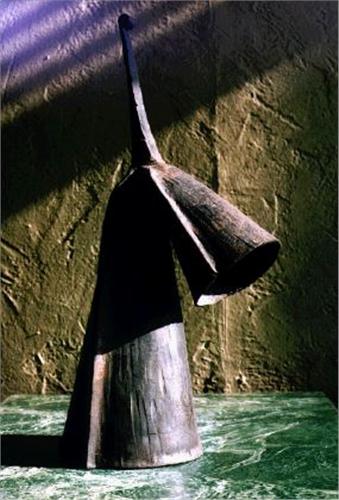 Congolese Bell Money. In rare double or twin form. C. 1850-1890, iron, hammered black and brown coloration. Primitive African barter money: 100 of these would buy a slave. In scarce large size, 9 -1/2 " long, connected to another elongated bell 4 -1/2 " long; neither portion with clappers, as a sound was produced by beating with a rod or other object. Both bells are held together with one pointed handle at top. Used from Togo to East Africa in ceremonies as well as barter, sometimes the cause of wars due to rarity. This example smoothly finished and in exceptionally fine condition.