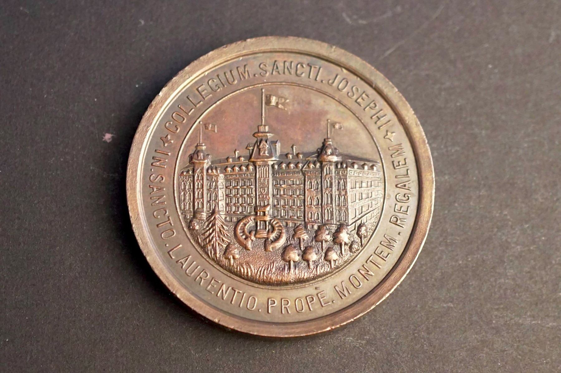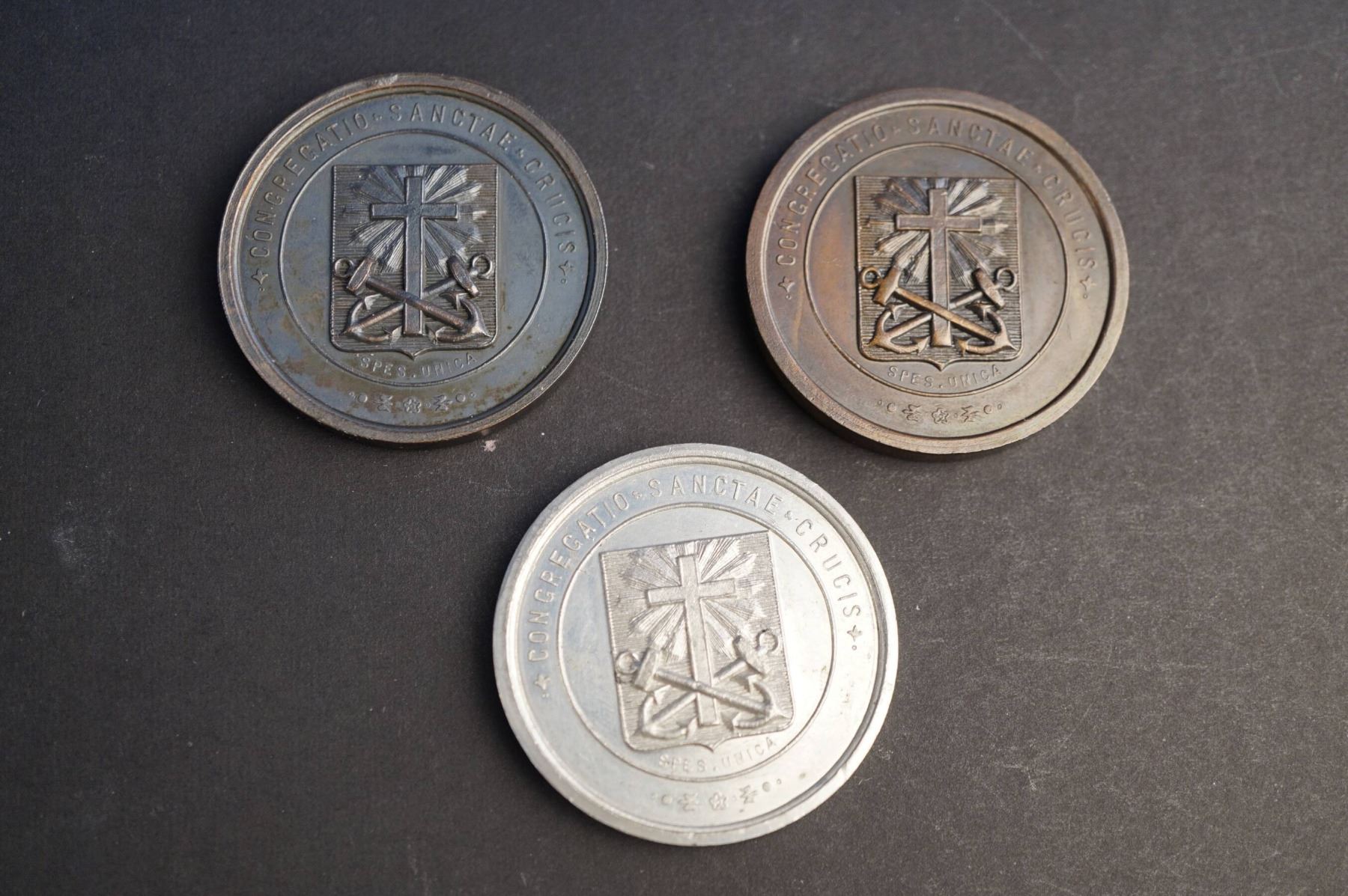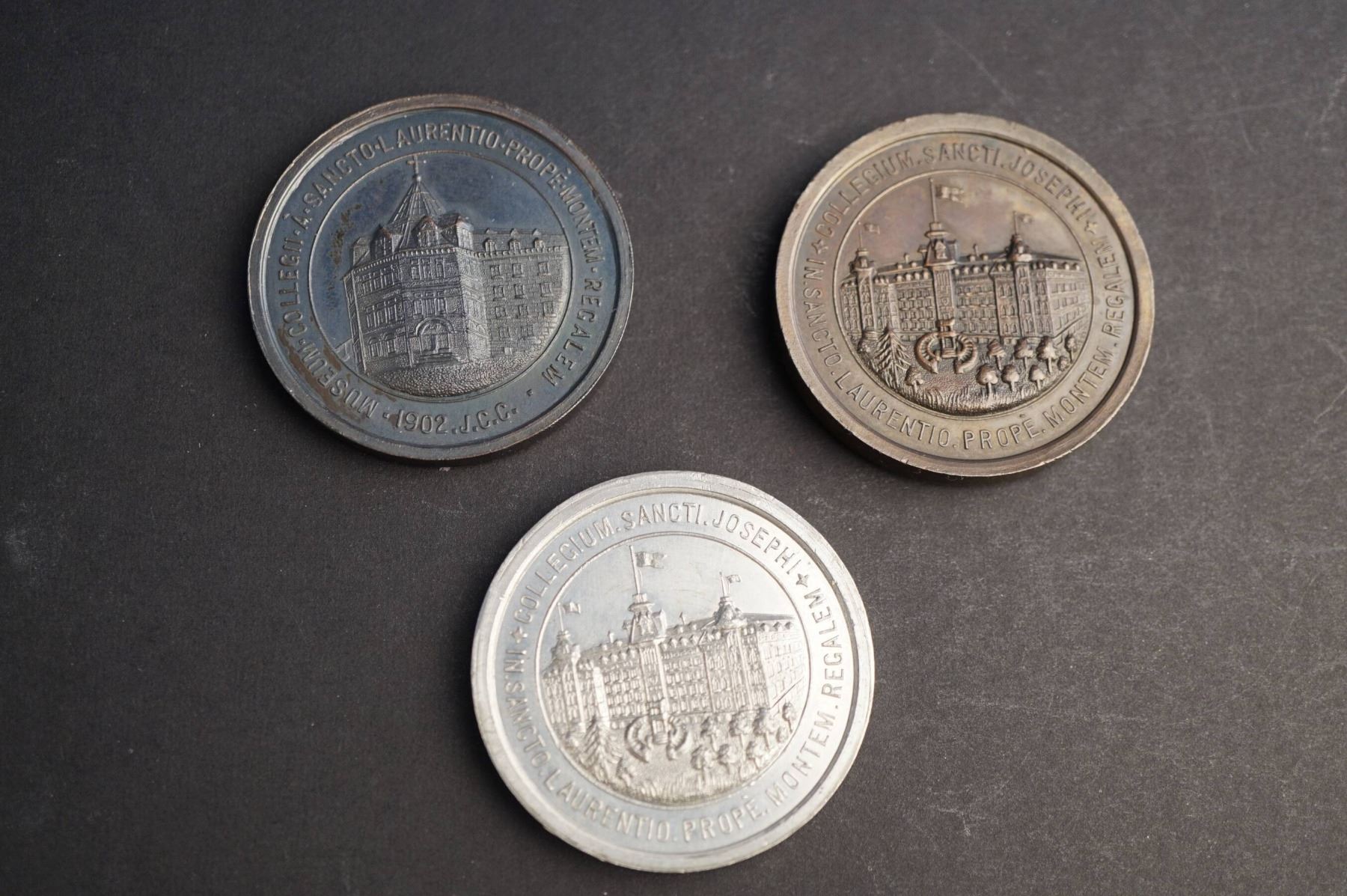 Congregation of the Holy Cross, Montréal - Collège St. Joseph (2), Collège St-Laurent (1) - Lot of three medals, all with a common reverse. 43 mm. The common Reverse: CONGREGATIO SANCTAE CRUCIS. In the central circle: a shield with a cross, radiate on the top half. At the bottom: Two anchors crossed. Below the shield: SPES UNICA. 1) MUSEUM COLLEGII. À. SANCTO LAURENTIO. PROPÈ-MONTEM REGALEM 1902 J. C. C. A central circle, depicting the college building, Darkened copper, 41.9 grams. UNC. 2) Aluminum, 33.5 grams. And 3) Copper, 53.7 grams, COLLEGIO SANCTI JOSEPHI SANCTO LAURENTIO PROPÈ MONTEM REGALEM. In the inner circle, a design of the college building.