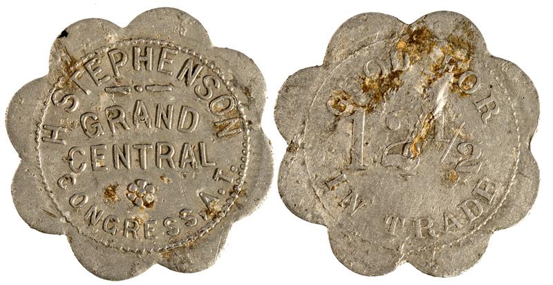 Obverse: H. Stephenson / Grand / Central / Congress, A.T.; reverse: Good For / 12 1/2 / In Trade. Al, 29mm, R8. Good condition, some dirt on reverse.