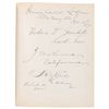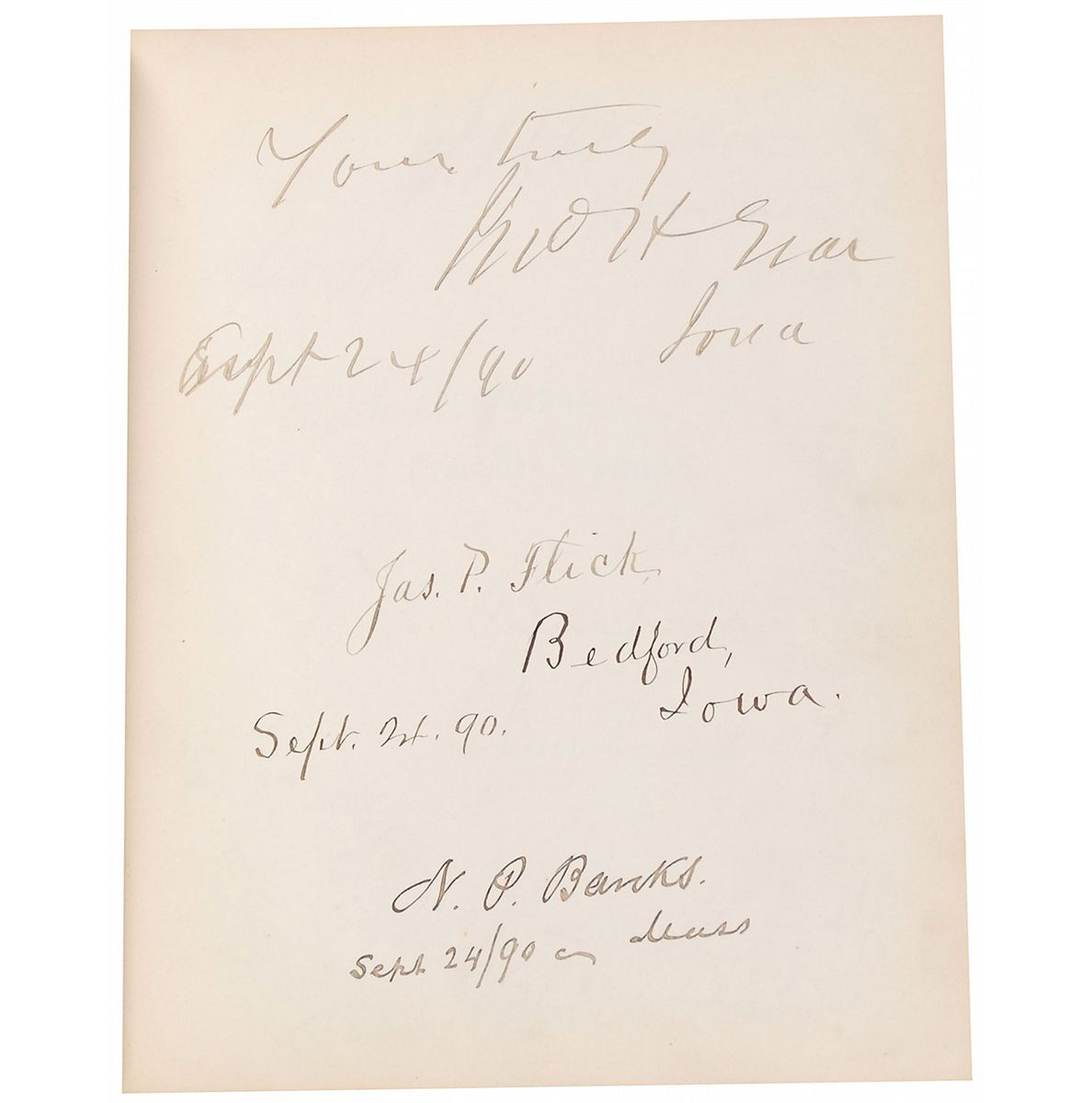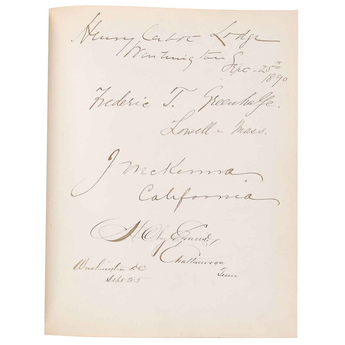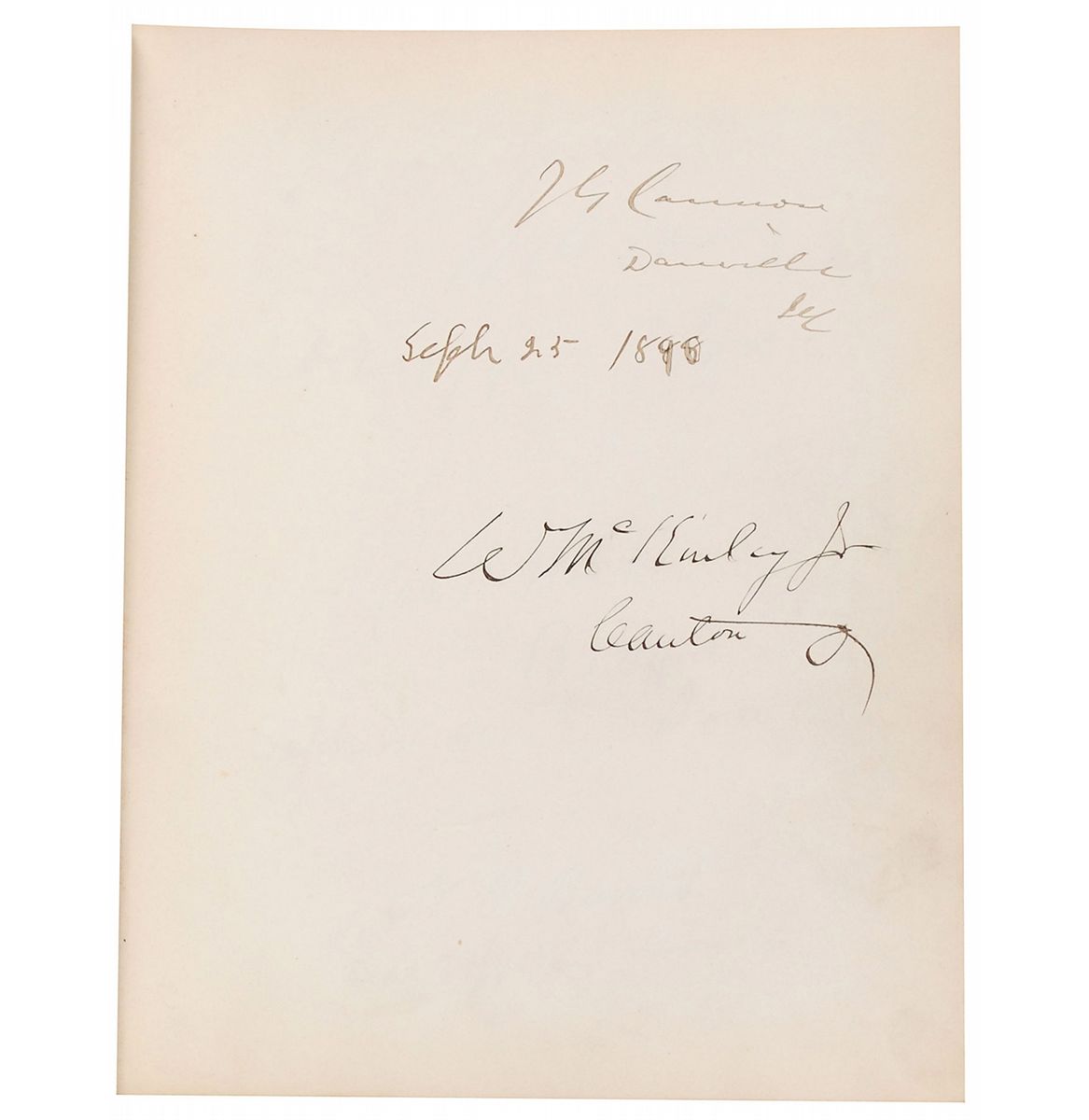 Hardcover autograph album, 7.5 x 9.25, signed inside by 153 members of the 51st Congress in 1890. Signers include: William McKinley, Nathaniel P. Banks, Melvin M. Boothman, Marriott Brosius, Solomon G. Comstock, William C. Cooper, Henry Clay Evans, Lewis P. Featherstone, Charles H. Grosvenor, Bishop W. Hoskins, Leonidas C. Houk, Henry Cabot Lodge, Elijah A. Morse, Philip S. Post, John A. Quackenbush, Henry J. Stockbridge, Jr., and William C. Wallace. Some of the signers were serving as pages at the time. In fine condition, with scattered wear and surface loss to covers and a loose spine. The interior pages are nicely preserved. A more comprehensive list is available online at rrauction.com.