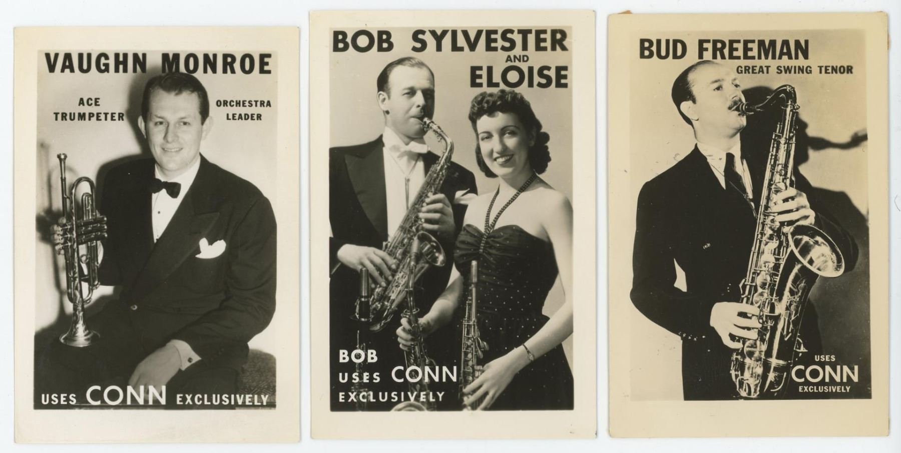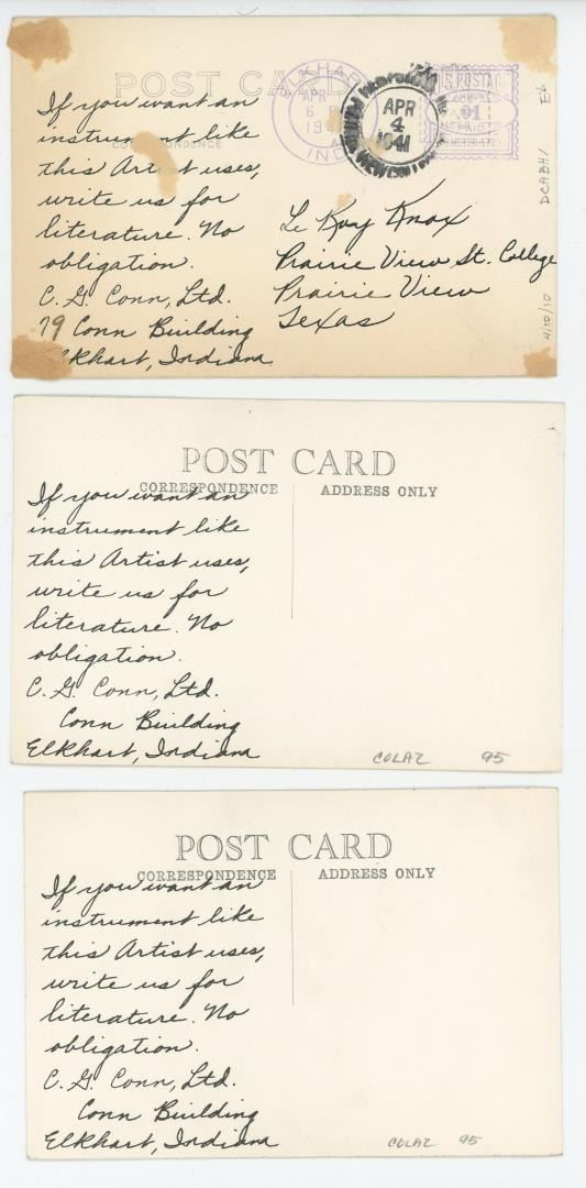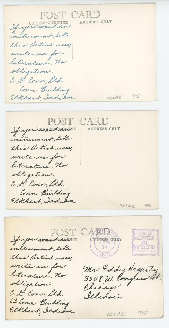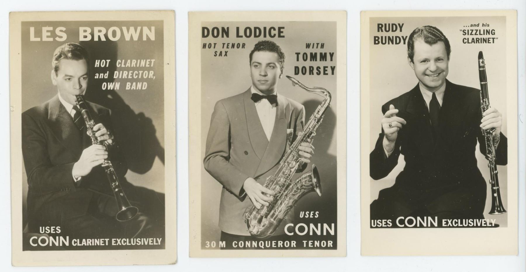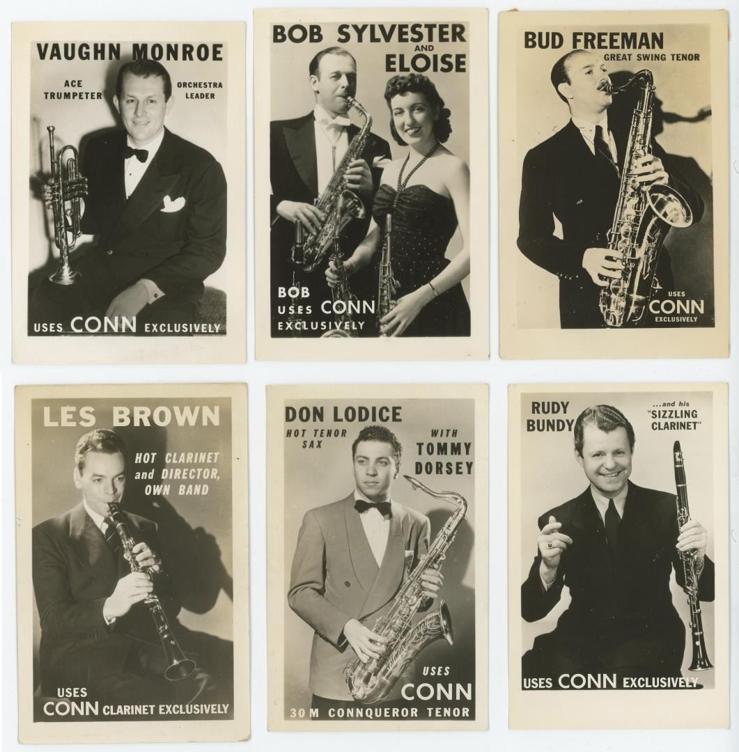 Nice grouping of advertising postcards. Vaughn Monroe, Bob Sylvester, Bud Freeman, Les Brown, Don Lodice, Rudy Bundy.