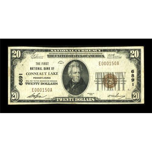 <B>Conneaut Lake, PA</B></I> - $20 1929 Ty. 1 <B>The First NB</B></I> Ch. # 6891<BR> This is just the fourth small size note reported for this bank. While Track and Price reports two offerings of large notes from here since 2000, no offerings of Series 1929 examples from this bank can be found. <B>Fine-Very Fine</B></I>.<BR><I>From The Kansas City Collection.</B></I><BR><BR><b>Shipping:</b> Coins & Currency (<a target="_blank" href="http://www.heritageauctions.com/common/shipping.php">view shipping information</a>)