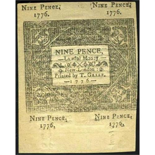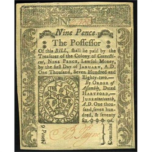 <b>Connecticut. 9 Pence Colonial currency. Choice Crisp Unc.</b> Issue of June 19, 1776, a popular Independence year currency. Crisp paper and nice red signature.