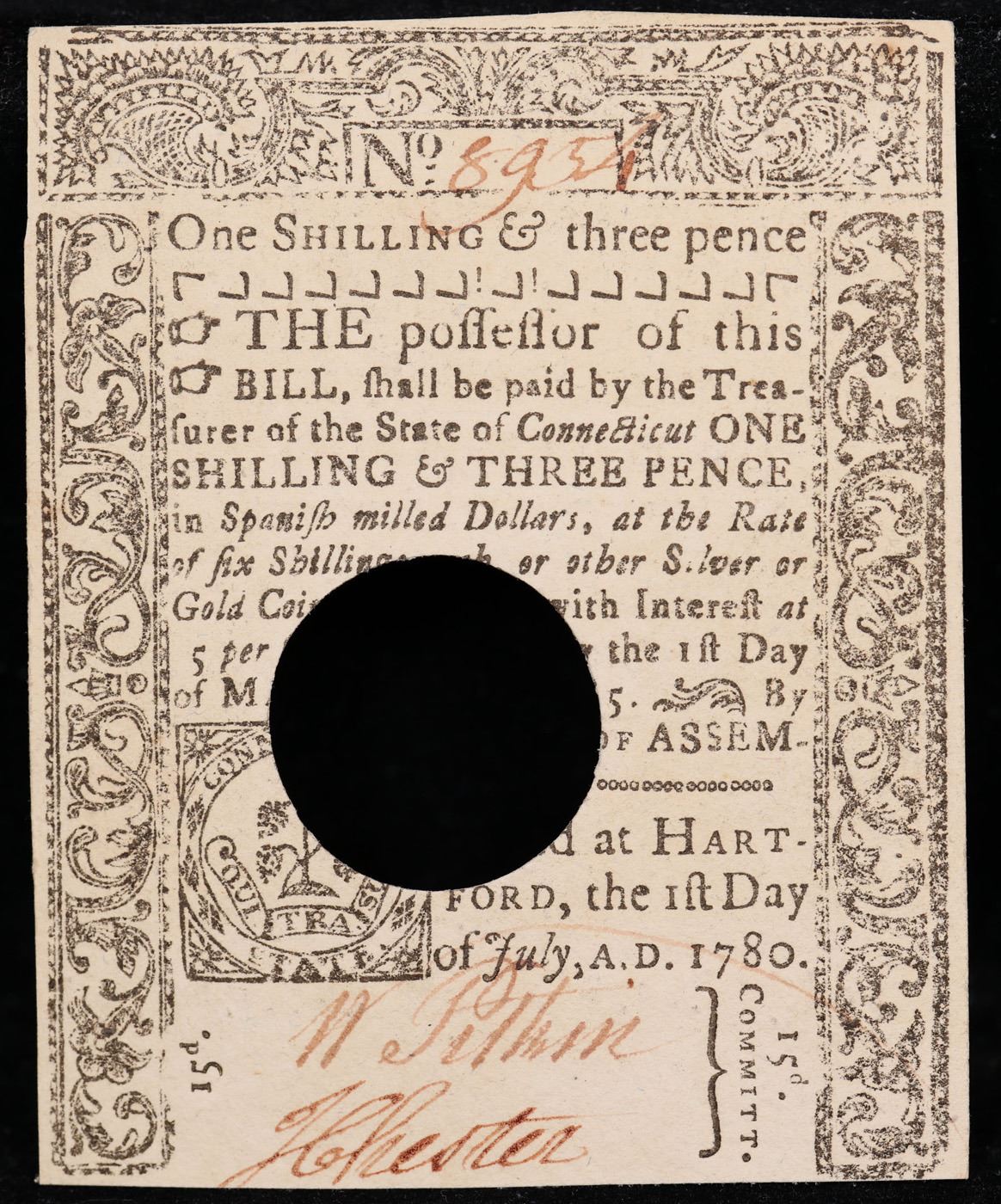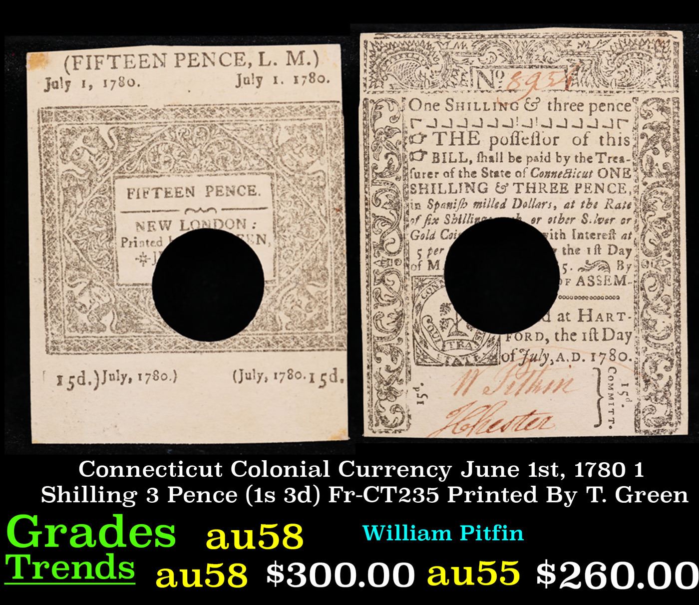 Connecticut Colonial Currency June 1st, 1780 1 Shilling 3 Pence (1s 3d) Fr-CT235 Printed By T. Green
