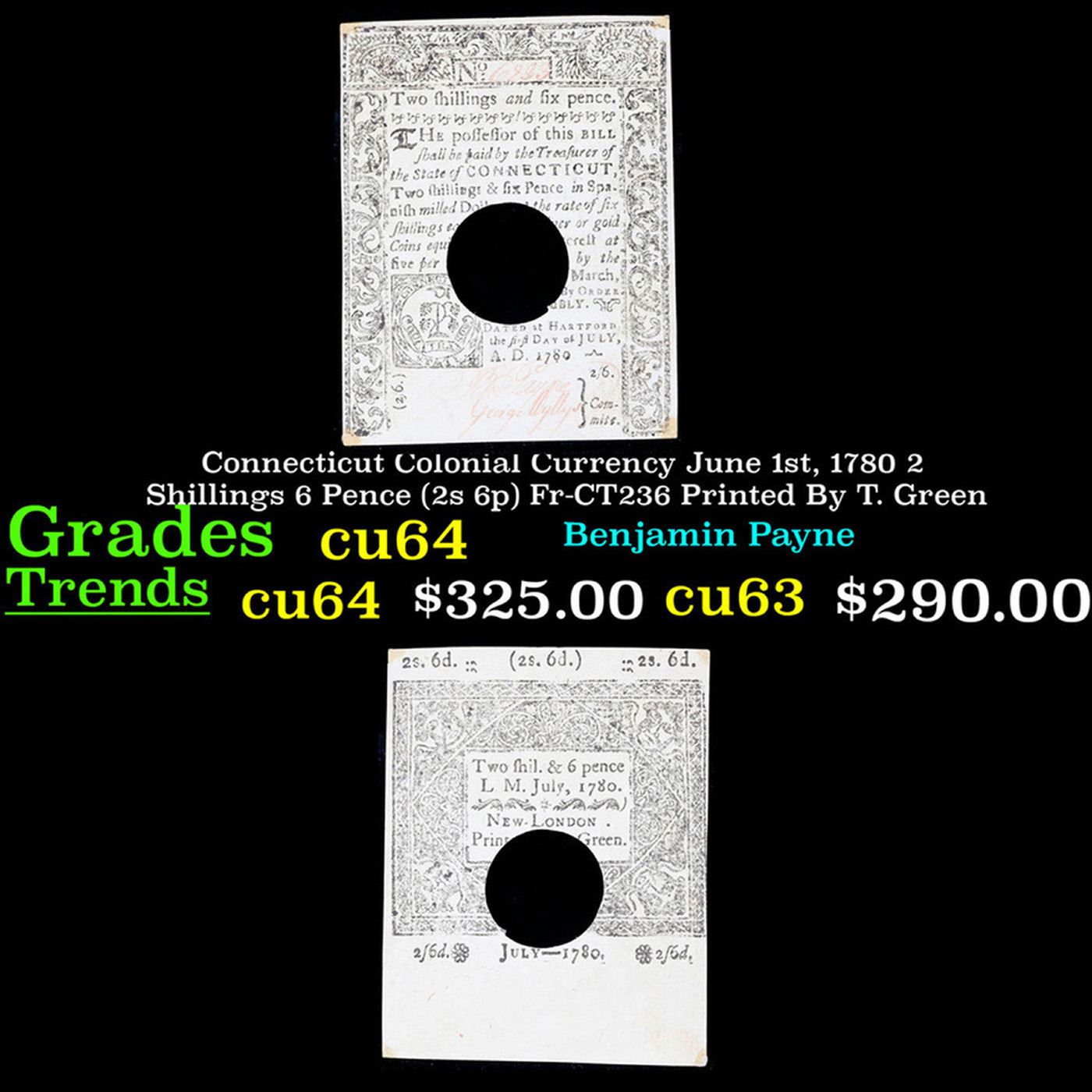 Connecticut Colonial Currency June 1st, 1780 2 Shillings 6 Pence (2s 6p) Fr-CT236 Printed By T. Green Grades Choice CU.