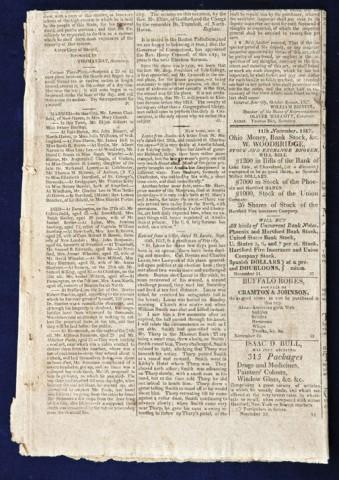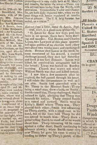 Connecticut Courant, Hartford, November 11th, 1817 article from a letter, mentioning duel between Col. Benton and Charles Lewis, and mentions a duel between Smith & Tharp From the Robert Orbello collection. The Benton/Lewis duel is published in the book Famous American Duels by Don. C Seitz. The newspaper shows some aging and staining but is legible. From the William R. Orbelo Collection. Est: $300 - $600