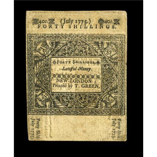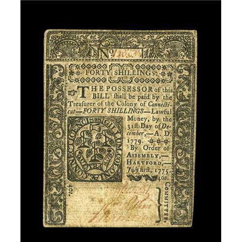 Connecticut July 1, 1775 40s About New. This fully-embo Connecticut July 1, 1775 40s About New.