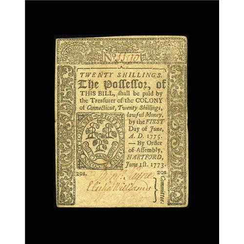 <B>Connecticut June 1, 1773 20s Extremely Fine.</B></I> There are tiny splits on either side of the lone center fold. Also, two pinholes are visible on this scarcer Connecticut issue.<BR><BR><b>Shipping:</b> Coin/Currency (<a target="_blank" href="http://www.heritageauctions.com/common/shipping.php">view shipping information</a>)