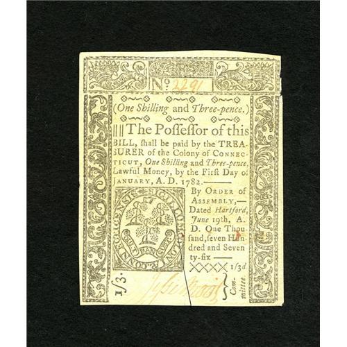 <B>Connecticut June 19, 1776 1s/3d Choice About New CC.</B></I> A tiny corner bend is noted on this issue.<BR><BR><b>Shipping:</b> Coins & Currency (<a target="_blank" href="http://www.heritageauctions.com/common/shipping.php">view shipping information</a>)