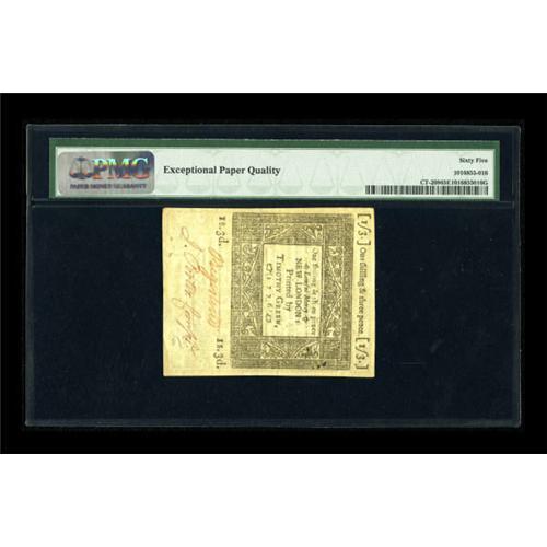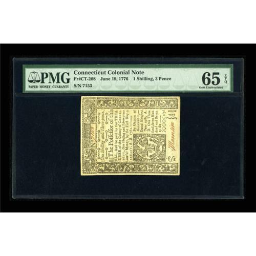 <B>Connecticut June 19, 1776 Uncancelled 1s/3d PMG Gem Uncirculated 65 EPQ.</B></I> This issue is as deeply embossed as one will find. The paper quality is pleasing and complements the eye appeal.<BR><BR><b>Shipping:</b> Coins & Currency (<a target="_blank" href="http://www.heritageauctions.com/common/shipping.php">view shipping information</a>)