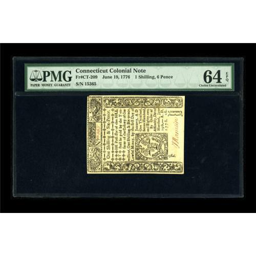 <B>Connecticut June 19, 1776 Uncancelled 1s/6d PMG Choice Uncirculated 64 EPQ.</B></I> Incredible embossing and superior paper quality are found on this Uncancelled Connecticut note. The signature and serial number are bold and the eye appeal is that of a screaming Gem.<BR><BR><b>Shipping:</b> Coins & Currency (<a target="_blank" href="http://www.heritageauctions.com/common/shipping.php">view shipping information</a>)