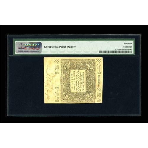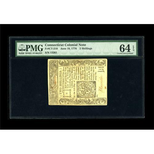 <B>Connecticut June 19, 1776 Uncancelled 2s PMG Choice Uncirculated 64 EPQ.</B></I> Fresh, original paper waves are noted. Interestingly, this is one of only about a half dozen examples of this denomination that we've handled.<BR><BR><b>Shipping:</b> Coins & Currency (<a target="_blank" href="http://www.heritageauctions.com/common/shipping.php">view shipping information</a>)
