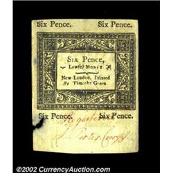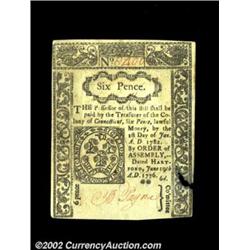 Connecticut June 19, 1776 6d New. There is some edge damage and a crosscut cancel. Important notice: We expect to be auctioning lots at the rate of 200-250 per hour. Sometimes eBay Premier live bid software cannot keep up with that pace, so we strongly recommend that you place a realistic proxy bid now as insurance to avoid disappointment. Also please note that all Heritage/CAA lots purchased through eBay Premier carry a 20% Buyer's Premium. Please make sure you read the Terms and Conditions.