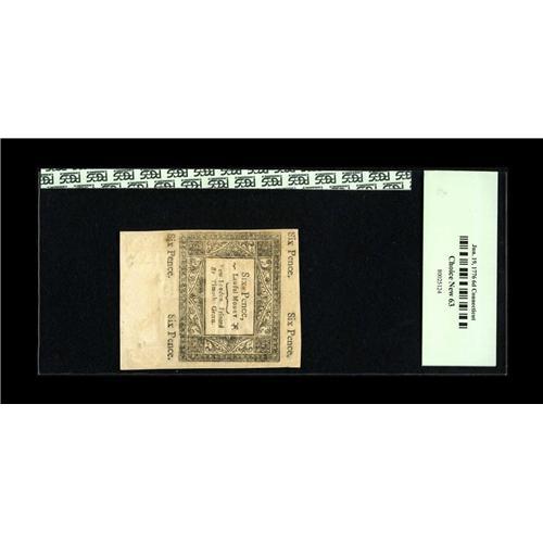<B>Connecticut June 19, 1776 6d PCGS Choice New 63.</B></I> This uncancelled example retains very bright, well embossed surfaces with a couple of age spots noticed. <BR><BR><b>Shipping:</b> Coin/Currency (<a target="_blank" href="http://www.heritageauctions.com/common/shipping.php">view shipping information</a>)