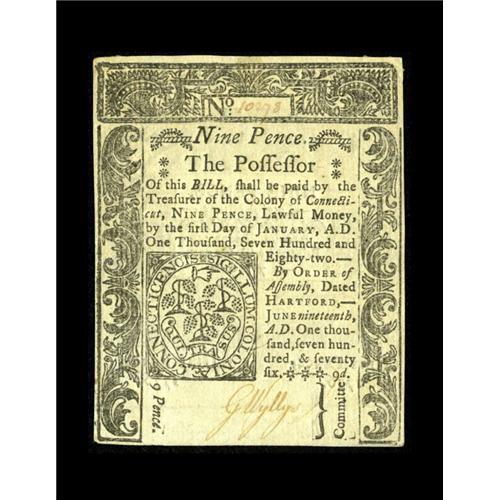 <B>Connecticut June 19, 1776 9d Gem New.</B></I> Even though the margins are a little tight this is some of the nicest paper you will ever encounter on any colonial note. The embossing is so well struck it could induce a paper cut and the signatures and printing will leave you in awe. Most importantly the note is uncancelled and much scarcer as such.<BR><BR><b>Shipping:</b> Coin/Currency (<a target="_blank" href="http://www.heritageauctions.com/common/shipping.php">view shipping information</a>)