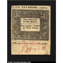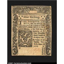 Connecticut June 7, 1776 1s Choice New.<p>There is a short slit-cancel at the bottom center; even so this note is an extremely nice example. Important notice: We expect to be auctioning lots at the rate of 200-250 per hour. Sometimes eBay Premier live bid software cannot keep up with that pace, so we strongly recommend that you place a realistic proxy bid now as insurance to avoid disappointment. Also please note that all Heritage/CAA lots purchased through eBay Premier carry a 20% Buyer's Premium.