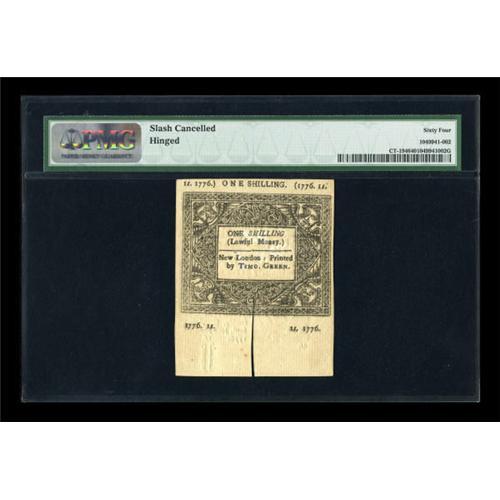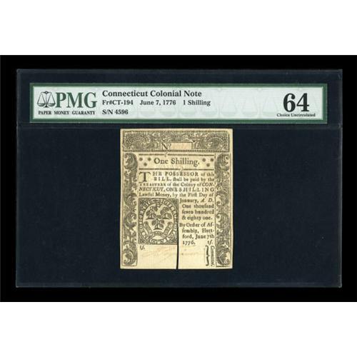 <B>Connecticut June 7, 1776 1s PMG Choice Uncirculated 64.</B></I> This slash canceled note also exhibits some hinge remnants.<BR><BR><b>Shipping:</b> Coins & Currency (<a target="_blank" href="http://www.heritageauctions.com/common/shipping.php">view shipping information</a>)
