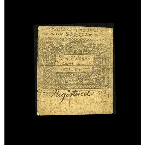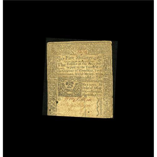 <B>Connecticut May 10, 1770 5s Fine, CC.</B></I> This note has been neatly sewn along the center fold.