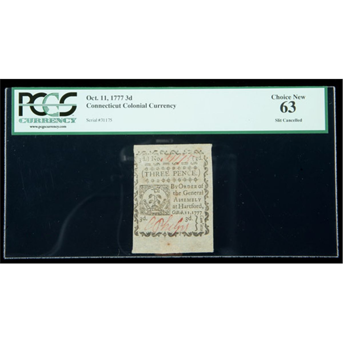 Connecticut Oct. 11, 1777 3d. PCGS Choice New 63 Slit Cancelled. . Fr-CT-215. A decent looking blue paper-printed note with a tight left margin and a single small spot in the wide bottom margin.