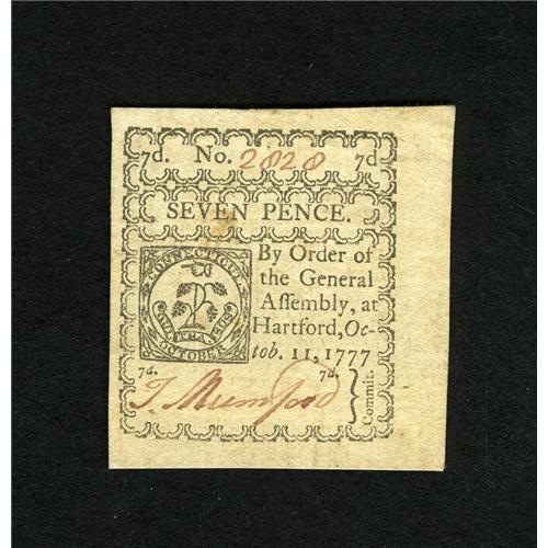 <B>Connecticut October 11, 1777 7d Extremely Fine-About New.</B></I> A pair of light diagonal folds are the only circulation this ex-Ford piece has encountered. Bright color and deep inks are noticed.<BR><BR><b>Shipping:</b> Coins & Currency (<a target="_blank" href="http://www.heritageauctions.com/common/shipping.php">view shipping information</a>)