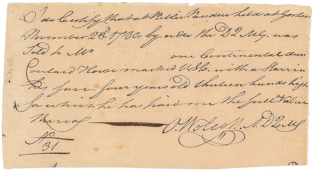 Signer of the Declaration of Independence from Connecticut (1726–1797) who also signed the Articles of Confederation and served as a major general in the Connecticut Militia during the Revolutionary War. Revolutionary War–dated ADS, signed “O. Wolcott A.D.Q.M.G.,” one page, 7.5 x 4, November 23, 1780. As assistant deputy quartermaster general, Wolcott attests to the sale of “one Continental dun Coloured Horse marked U.S.C. with a Starr in his face, four years old, thirteen hands high.” In fine condition, with some scattered light foxing. Accompanied by an unsigned engraving.