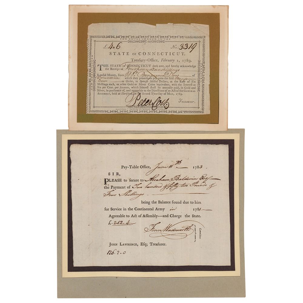 Two partly-printed DSs, one signed by Peter Colt and the other signed by Finn Wadsworth, both one page, 6.5 x 4.75 and 8.25 x 6.5, dated June 11, 1783, and February 1, 1789. The Colt-signed document is a State of Connecticut promissory note stating that it owes Benjamin Dowe “Four pounds six shillings…agreeably to the Directions of Act of the General Assembly, held at Hartford,” signed below by Colt as state treasurer; and Wadsworth-signed document is a pay order from the Pay-Table Office for “Two hundred & fifty two Pounds & Four Shillings” to be given to Abraham Baldwin “for Service in the Continental Army in 1781,” signed below by Wadsworth as a member of Connecticut's Committee of the Pay Table.” Both documents are affixed to slightly larger backing sheets. In overall fine condition.