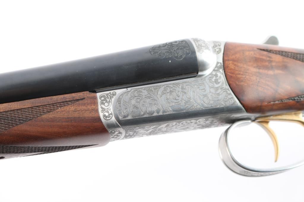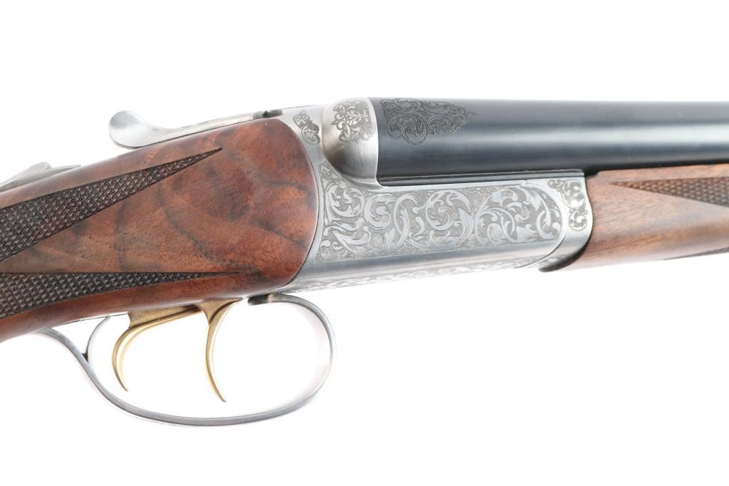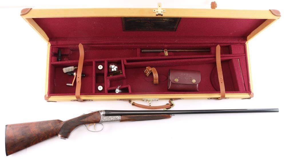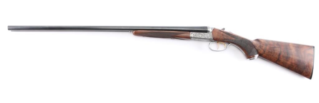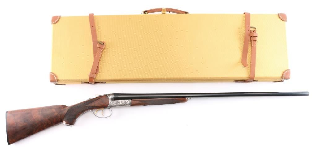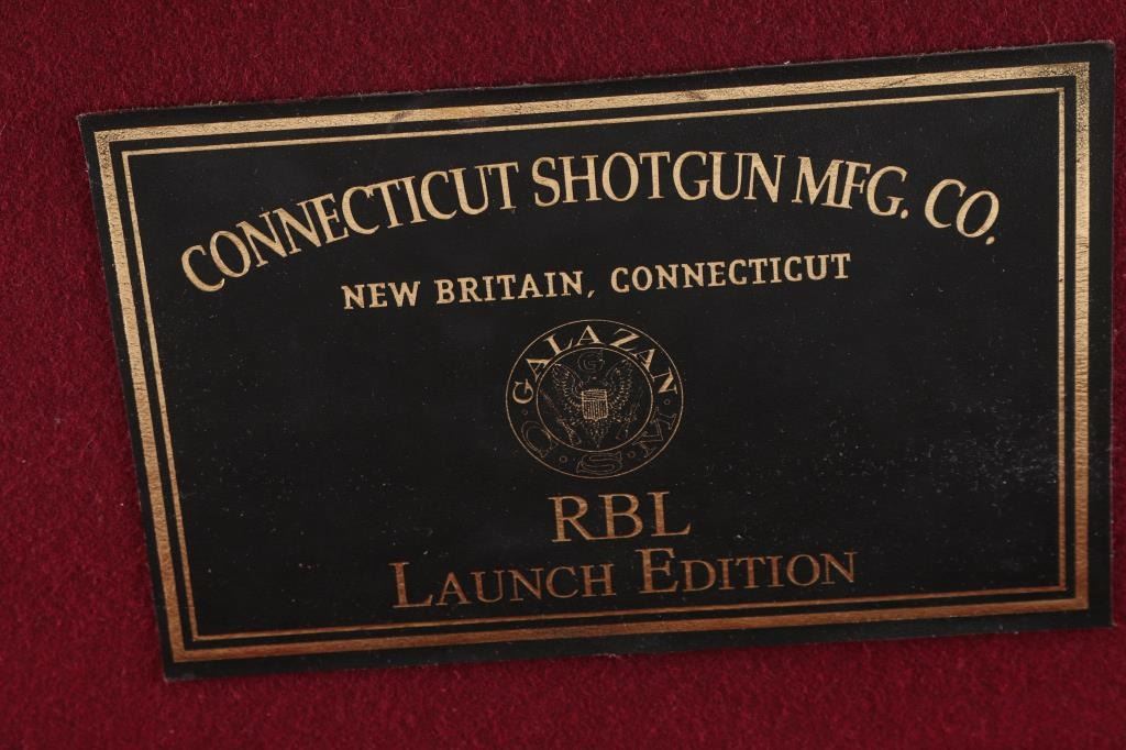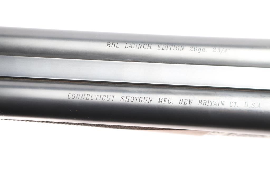 SN: RBL002080. RBL (Round Body Boxlock) 'Launch Edition' Fine American made round-action side-by-side shotgun chambered for 2 3/4" 20 gauge shells. Features 28" blued barrels with removable Mod. & Full chokes, automatic ejectors, concave rib, brass bead front sight, beautiful full coverage scroll engraving, coin finished receiver, polished grip cap, double gold toned triggers, auto tang safety, checkered top-lever, 14 1/4" length of pull, fancy checkered 3x walnut forend and straight grip shoulder stock with serrated hard rubber buttplate. Includes a Galazan tradition English style trunk case wrapped in canvas with maroon felt lined interior which includes a cleaning set, accruements and leather choke pouch with Skeet, Imp. Cyl , Improved Modified & tool. All in excellent condition with the exception on the right case buckle is missing the prong. Matching SN on upper tang, watertable and barrels. Shotgun exhibits all of it's original finish. Action is smooth, bores are impeccable and wood stocks are extra fine.