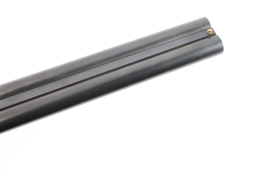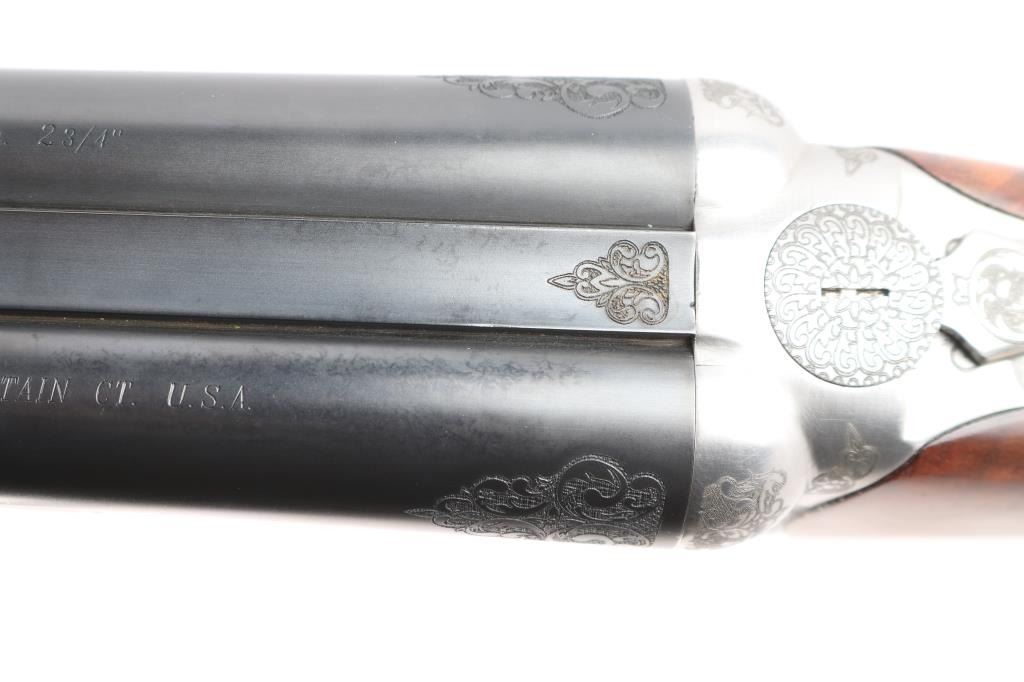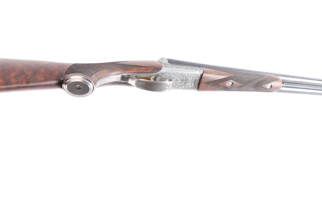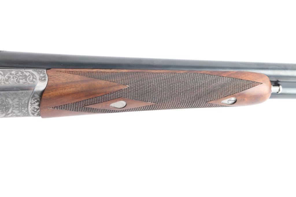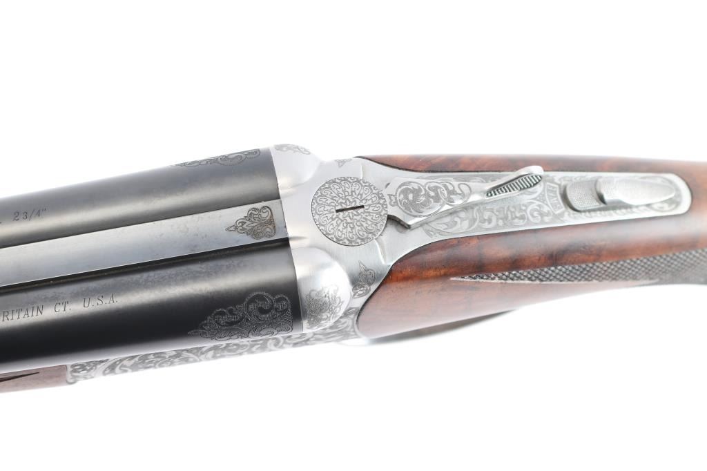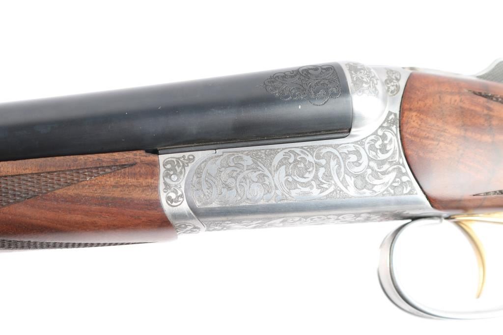 SN: RBL002080. RBL (Round Body Boxlock) 'Launch Edition' Fine American made round-action side-by-side shotgun chambered for 2 3/4" 20 gauge shells. Features 28" blued barrels with removable Mod. & Full chokes, automatic ejectors, concave rib, brass bead front sight, beautiful full coverage scroll engraving, coin finished receiver, polished grip cap, double gold toned triggers, auto tang safety, checkered top-lever, 14 1/4" length of pull, fancy checkered 3x walnut forend and straight grip shoulder stock with serrated hard rubber buttplate. Includes a Galazan tradition English style trunk case wrapped in canvas with maroon felt lined interior which includes a cleaning set, accruements and leather choke pouch with Skeet, Imp. Cyl , Improved Modified & tool. All in excellent condition with the exception on the right case buckle is missing the prong. Matching SN on upper tang, watertable and barrels. Shotgun exhibits all of it's original finish. Action is smooth, bores are impeccable and wood stocks are extra fine.