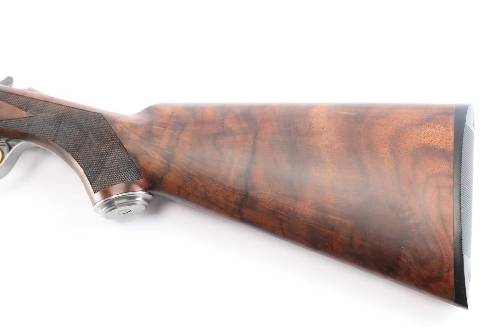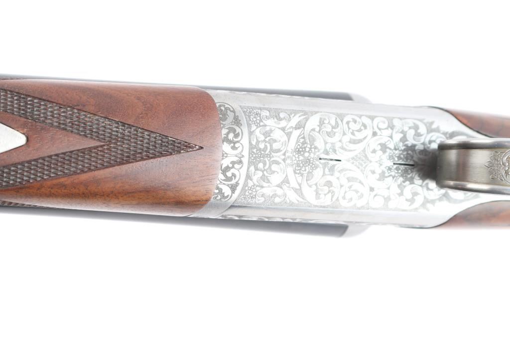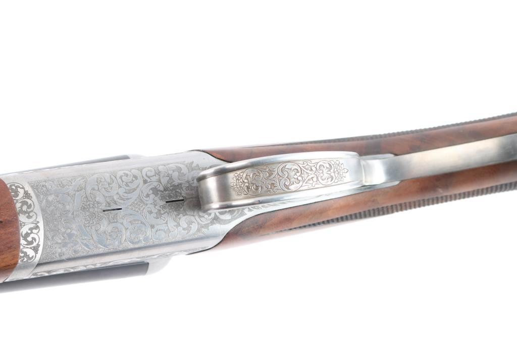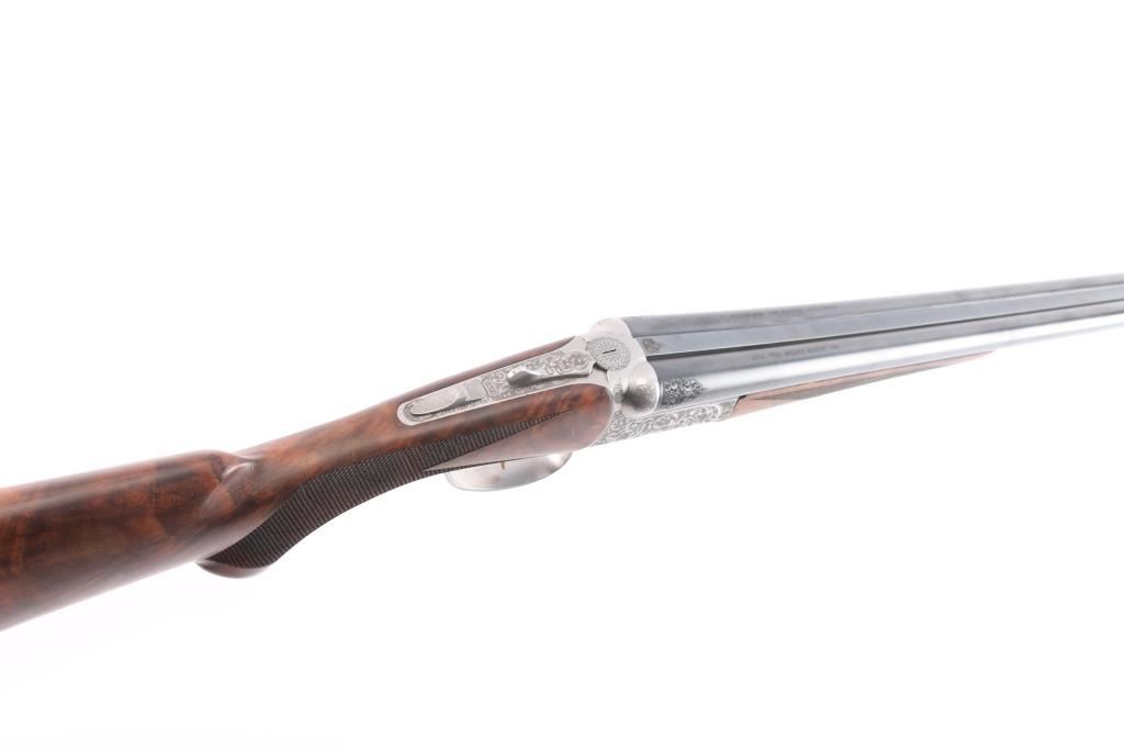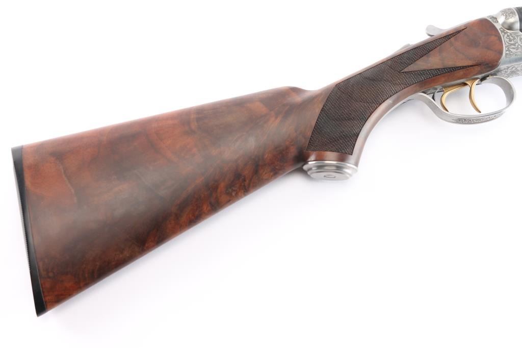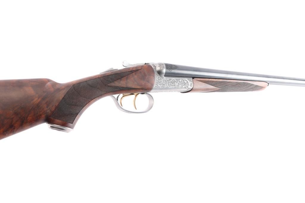SN: RBL002080. RBL (Round Body Boxlock) 'Launch Edition' Fine American made round-action side-by-side shotgun chambered for 2 3/4" 20 gauge shells. Features 28" blued barrels with removable Mod. & Full chokes, automatic ejectors, concave rib, brass bead front sight, beautiful full coverage scroll engraving, coin finished receiver, polished grip cap, double gold toned triggers, auto tang safety, checkered top-lever, 14 1/4" length of pull, fancy checkered 3x walnut forend and straight grip shoulder stock with serrated hard rubber buttplate. Includes a Galazan tradition English style trunk case wrapped in canvas with maroon felt lined interior which includes a cleaning set, accruements and leather choke pouch with Skeet, Imp. Cyl , Improved Modified & tool. All in excellent condition with the exception on the right case buckle is missing the prong. Matching SN on upper tang, watertable and barrels. Shotgun exhibits all of it's original finish. Action is smooth, bores are impeccable and wood stocks are extra fine.
