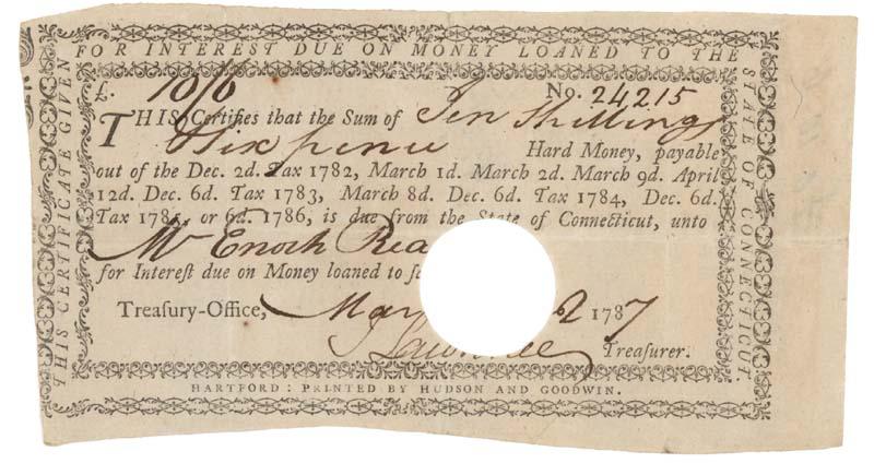 1787, Connecticut. Ten-shilling note issued “For interest due on money loaned to the State of Connecticut”. The note as payable out of taxes received. Signed by John Lawrence as treasurer. Scarce. Punch cancelled and Extremely Fine.