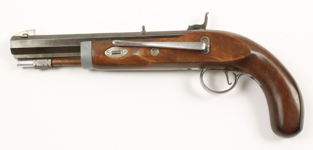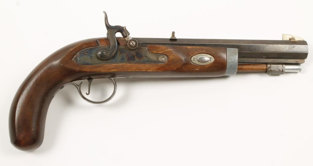 Modern U.S. made copy of a cap and ball pistol. Steel, aluminum, possibly pewter, plated brass and wood construction. Blued barrel, trigger and screws. Hammer, barrel plug and lock plate are color case hardened with light engraving. Trigger guard is bright in the white with surface rust and scratches. Belt clip is also bright and in the white. Ramrod ends are aluminum. Forend cap is a non-magnetic gray metal. Wedge plates are possibly plated brass. Wood is with dings and scratches. Mechanically sound with full and half-cock. Front and rear sights dovetailed into the octagonal barrel. Front sight blade is loose. Condition: Good.