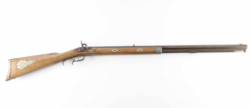 .50 Cal SN: 0023487 American made muzzle loading flintlock rifle in the classic Hawken style and chambered for 50 caliber ammunition. Features a 32" octagon barrel with brown finish, large silver blade front sight, rear sight, double set triggers, finger rest trigger guard, ramrod, brass patch box, and smooth wood straight grip half stock with pewter forend tip and crescent buttplate with right handed cheek rest. Cheek rest has ornamental studs outlining cheek rest. Rifle exhibits most of its original finish showing scattered handling marks with finish wearing off top and left side by hammer. Missing one ramrod holder near muzzle. Antique firearm. NRA Good Antique Firearm