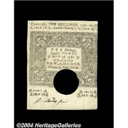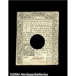 Connecticuts About New. Two notes, a 1s3d from the June 1, 1780 issue and a 10s from the July 1, 1780 issue. Both are hole canceled with a rather large quarter-size puncture. 2 notes <BR><BR><B>Important notice:</B> Heritage usually auctions material at the rate of 200-250 lots per hour. On some occasions eBay Live bid software or the Internet may not be able to keep up with the pace of the auction. We recommend placing a realistic absentee bid now as insurance to avoid disappointment. Occasionally the auctioneer may eliminate or reject an eBay Live bid, and the auctioneer may also reopen a lot after the close of the eBay live bidding (usually because we missed an audience bid), and may reject your bid even if it shows you as the winning bidder. By bidding via eBay Live, you agree that Heritage may award the lot to another bidder at its sole discretion under the circumstances described above or any other reasonable circumstances. Since eBay bids are not shown to us until we open the lot on the floor, we treat those bids just like floor bids. In most cases the floor responds before the eBay bid is presented to us, due to Internet lag time, so for consistency we have made it a policy that floor bids are always considered first over tie eBay live bids. Also please note that all Heritage lots purchased through eBay Live carry a 20% Buyer's Premium. Please make sure you read the Terms and Conditions before you bid. <BR><BR><B>IMPORTANT ANNOUNCEMENT ABOUT RESERVES:</B> Heritage now divulges all reserves on its web site 7 days before every auction. If you want to know whether the reserve on this lot has been met, and if not, what the reserve amount is, please visit this lot page on the HeritageCoin.com web site, or email: bid@HeritageGalleries.com