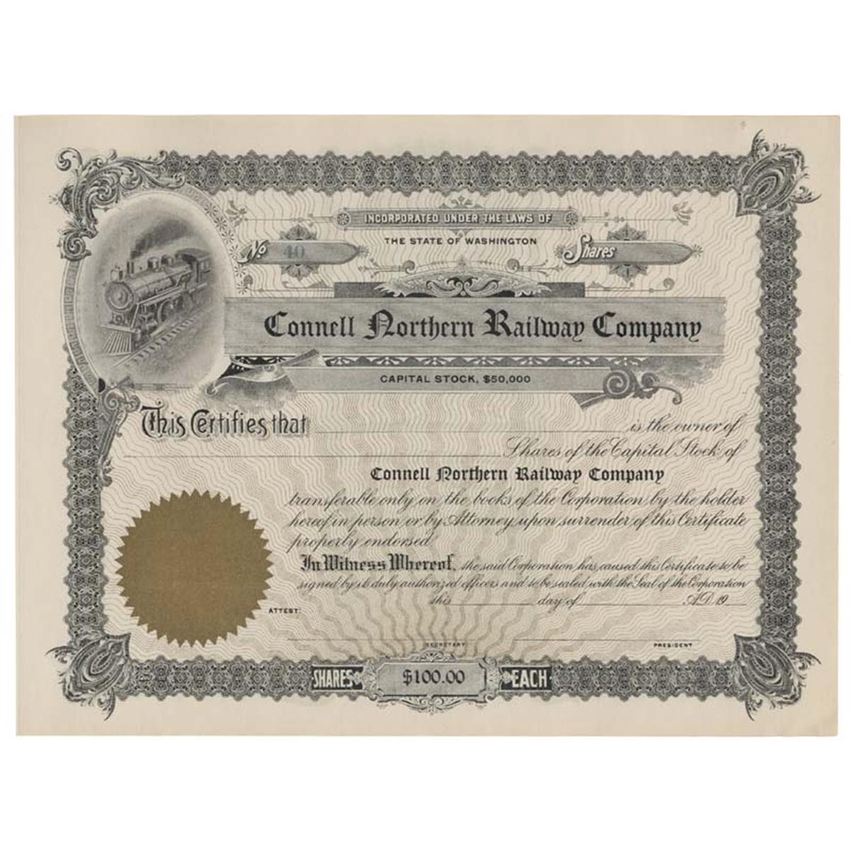 19--. Washington. Unissued stock certificate. Gold/Black. Very attractive piece with a photographic vignette of a steam locomotive at top left. Litho. Uncancelled and Excellent.