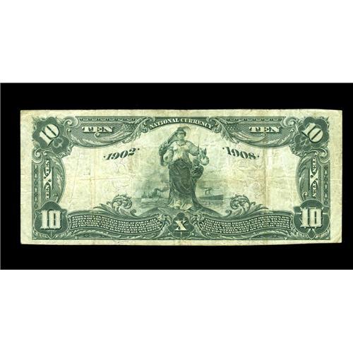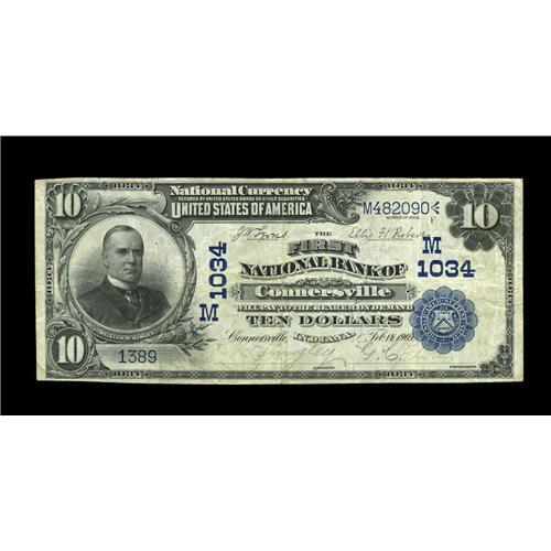 <B>Connersville, IN</B></I> - $10 1902 Date Back Fr. 616 <B>The First NB</B></I> Ch. # (M)1034<BR>Crisp, embossed paper highlights this new addition to the census which becomes the lowest serial number recorded for this type from here. <B>Very Fine.</B></I>