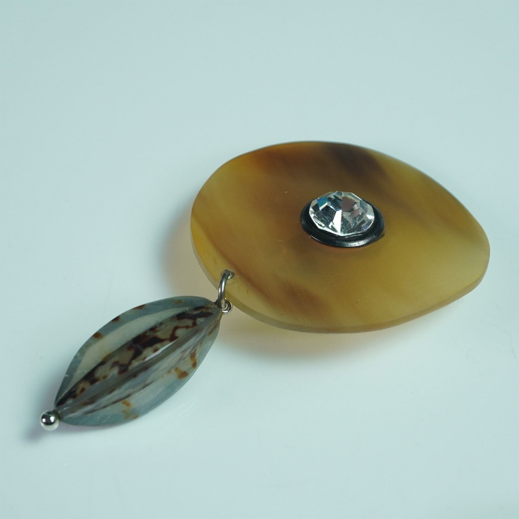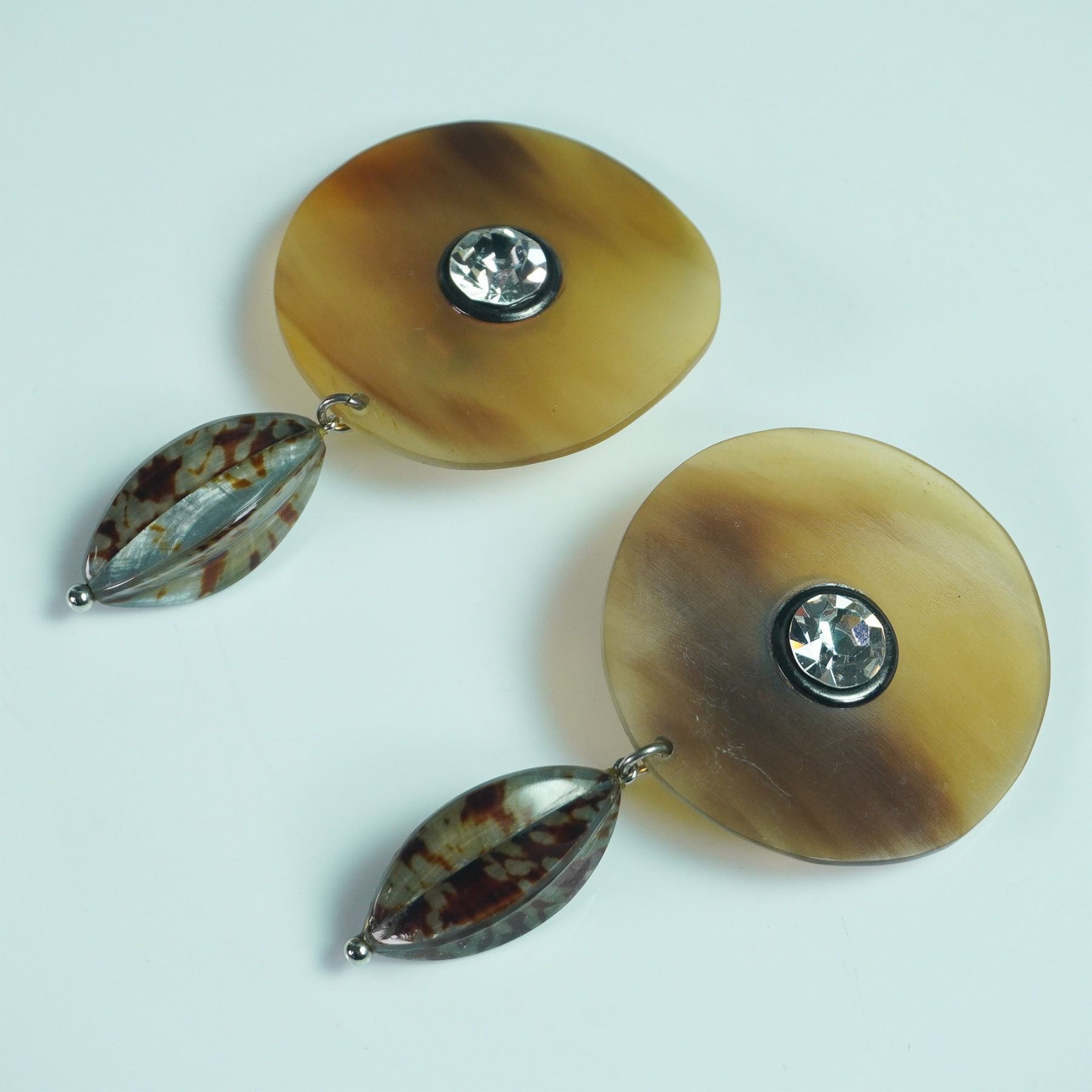A striking pair of clip-on earrings crafted from natural buffalo horn, featuring a round, polished horn base accented with a clear faceted crystal centerpiece. The earrings are further enhanced with a dangling marquise-shaped pendant, showcasing a tortoiseshell-like pattern in earthy brown and cream tones. Silver-tone metal clip-on backs provide a secure and comfortable fit.